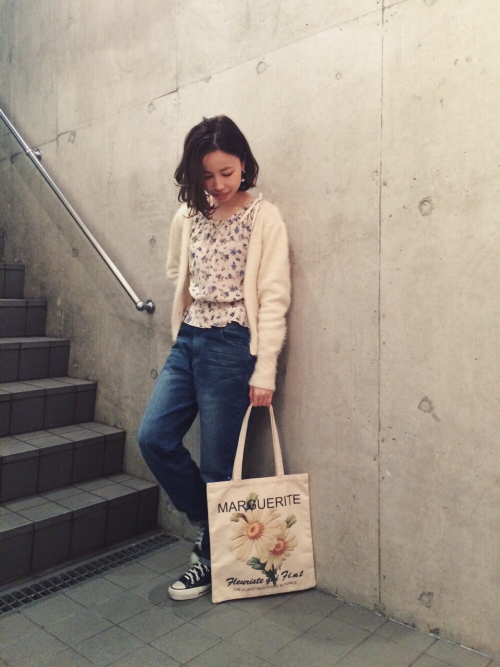 小花柄ブラウスにマーガレットのトートバッグ♡ お花好きにはたまりません♡♡♡