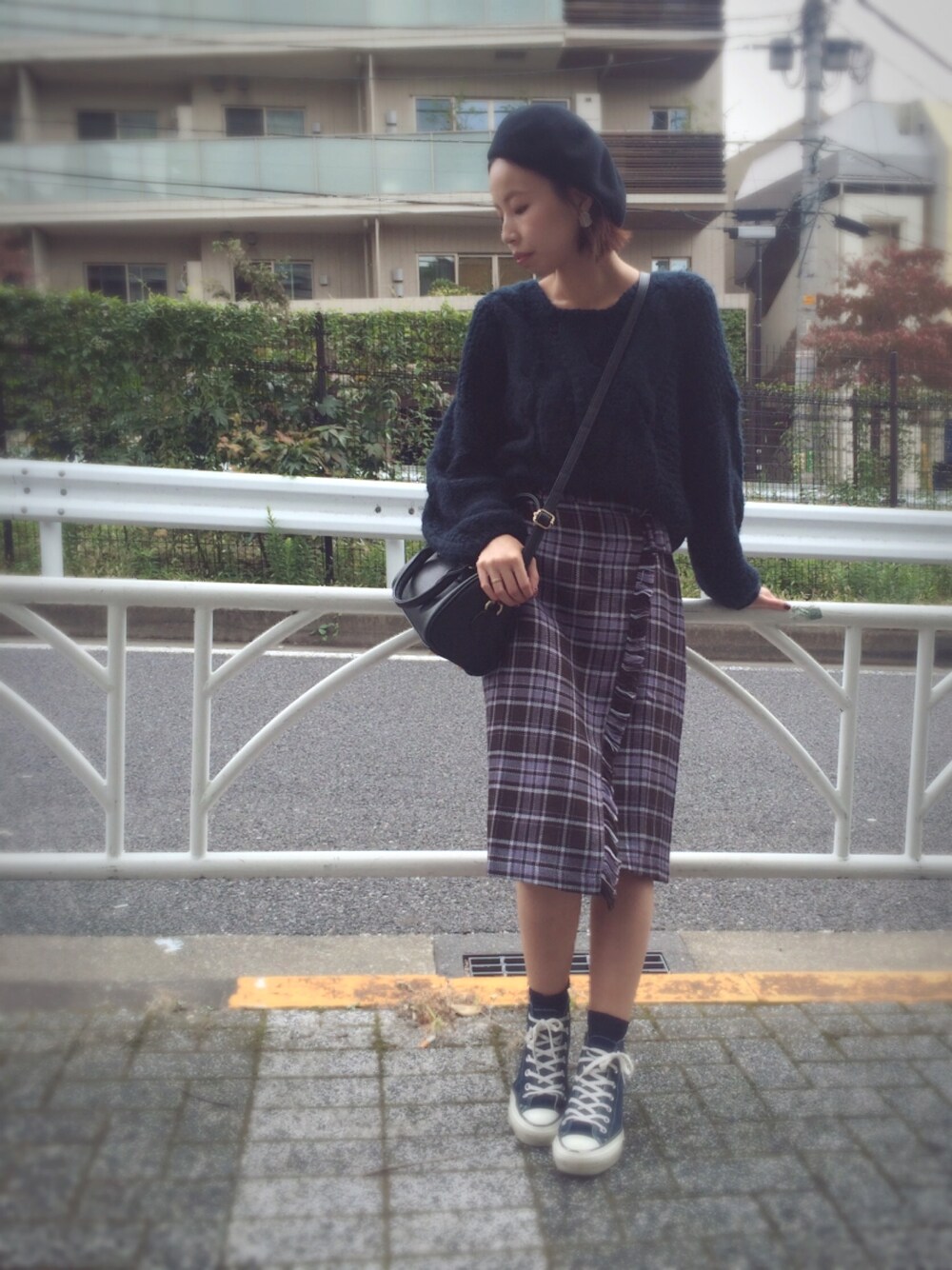 もこもこニットにチェックの巻きスカート風スカートを合わせました♡ コンバースやニット帽でオトナカジュアルをイメージ💜 Instagram始めました 👉@shimuramai