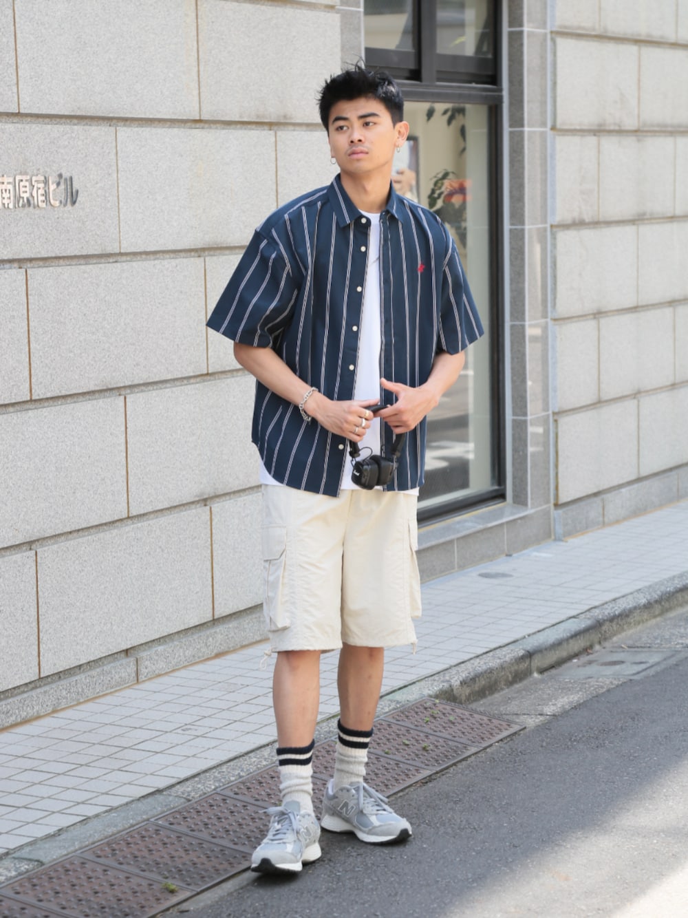 setup7_men(SETUP7)のカーゴパンツ「【MAISON CLUB】新素材追加!ワイドカーゴハーフパンツ ショートパンツ ナイロンショーツ / スウェットショーツ」を使ったコーディネート