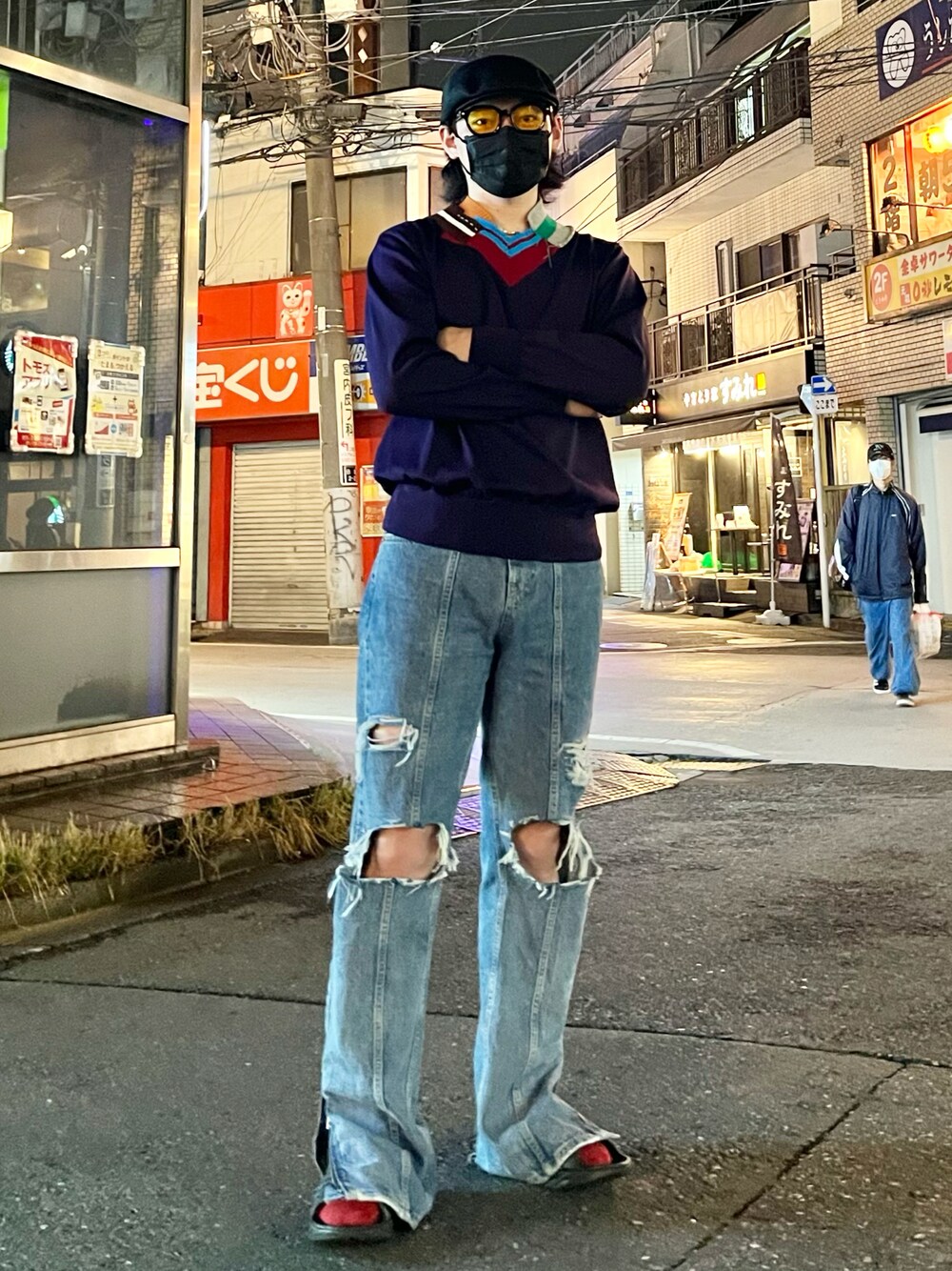 好きなものの詰め込み お気に入りのkolor紫ニット 自分で破りまくったZARAのジーンズで合わせる 足元はHOKAで締めくくる。至高。