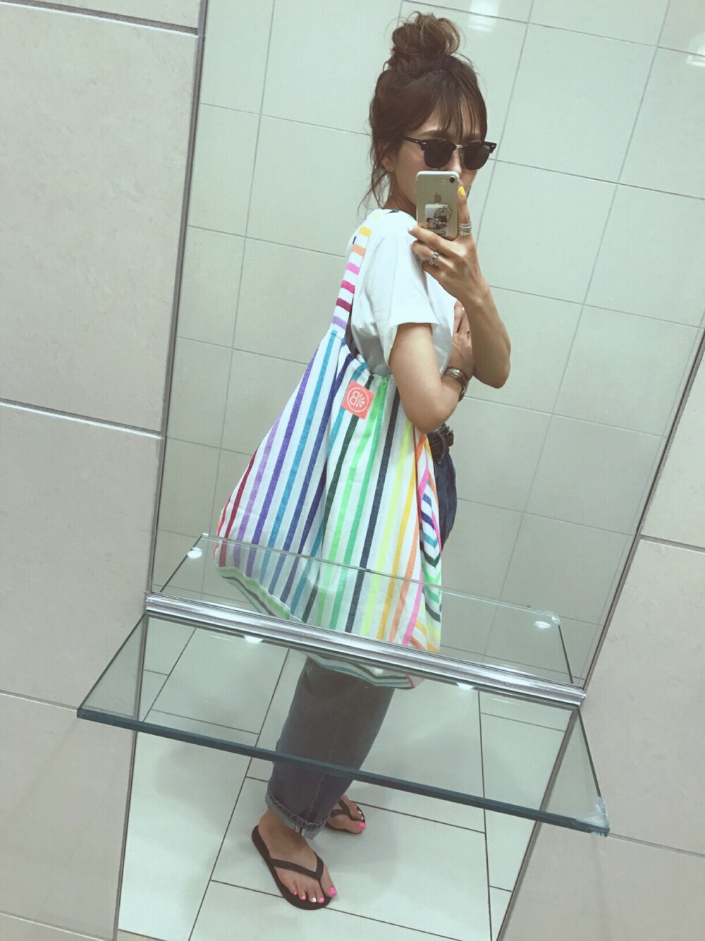 海にも行けるコーデで街中ぶらぶら🚶 シンプルなコーデにでかでかカラフルbag♡ この夏活躍間違いなしbag⛱ Instagram▶︎mailifemai