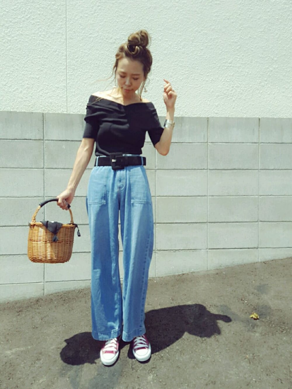 ピタリとしたオフショルトップスに ワイドパンツをキュッと ハイウエストスタイルで・・ 太めベルトで巻いて出来上がり~ あしもとはカジュアルにコンバース ♡ instaglam→mailifemai