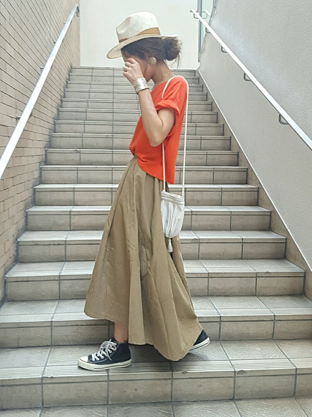 オレンジ×ベージュ 秋にも使えそうな組み合わせ♡ ゆるいオレンジカラーが可愛いTシャツはzarasaleでお買い得に 秋にもたくさん履きたいフィッシュテールデザインのスカートはブーツにも合わせたいな~ instaglam→mailifemai