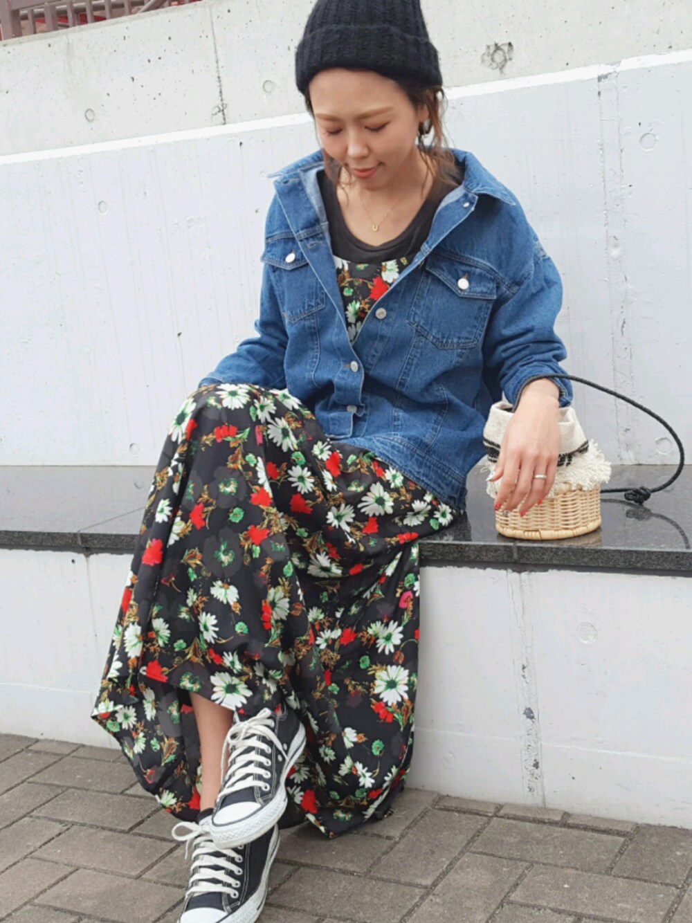 春になると着たくなる花柄アイテム♡ 甘くなりすぎないデザイン、カラーに一目惚れ オーバーサイズのデニムジャケットに合わせてカジュアルに着てみました(*´艸`) instaglam⏩mailifemai