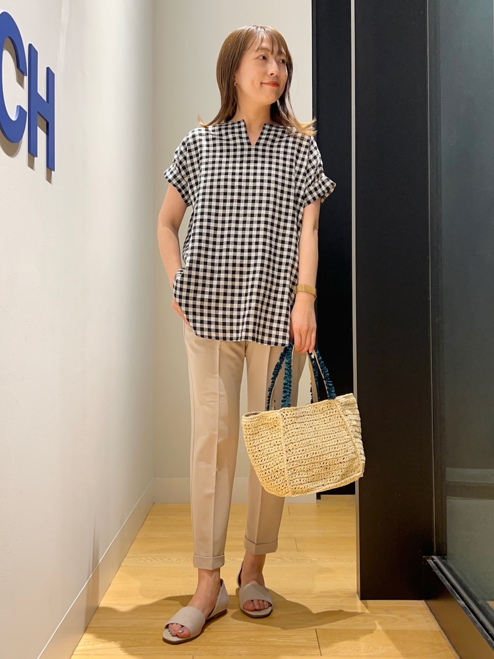 今日は通勤コーデ◎ 夏らしいギンガムチェックブラウスが入荷しました。 着丈も長すぎず、首元もVネックですっきり着用できました! テーパードパンツとあわせて きれいめなコーデにしました。
