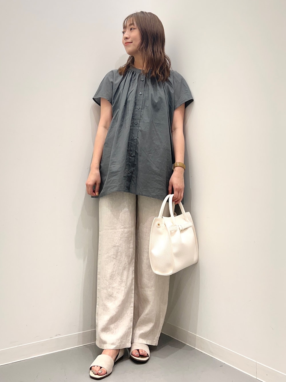 今日はカジュアルコーデ◎ トップスはコットンボイル生地で夏にぴったりなアイテムです。 フレンチスリーブで二の腕をスッキリ見せてくれます。 肩周りにギャザーが程よくボリュームを出してくれます。 154cmでピップをカバーしてくれるくらいの着丈でした。 サンダルはシンプルで合わせやすいアイテムです。 37サイズが少し余裕があるくらいでよかったです。 36サイズだとぴったりすぎて長時間履くと痛くなりそうなサイズ感でした。