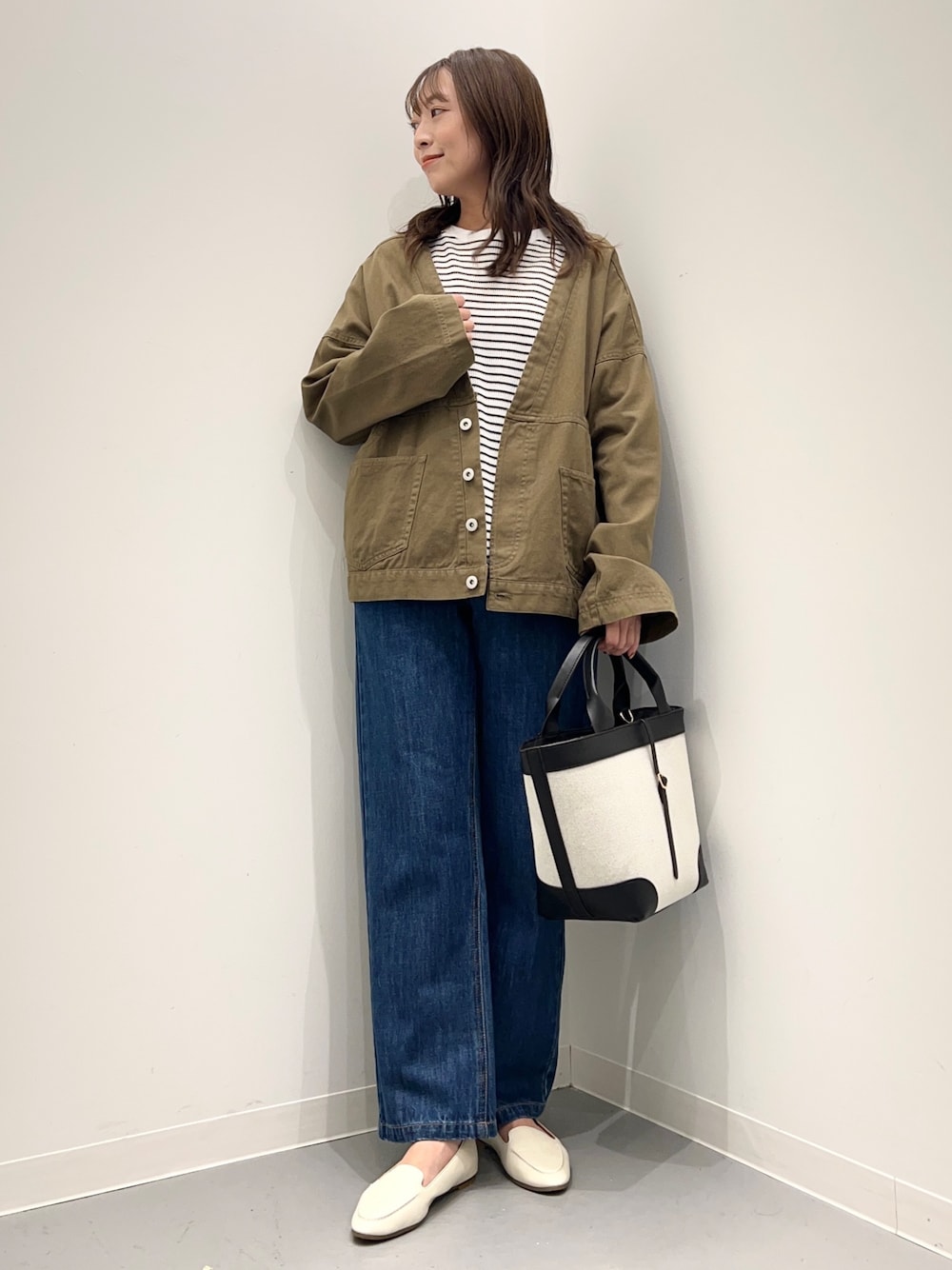 今日はカジュアルコーデ◎ ドアーズのジャケット着てみました。 首元はVネックで、着丈も長すぎないので すっきりとした印象にしてくれます。 カジュアルにボーダートップス×デニムに 合わせてみました◎