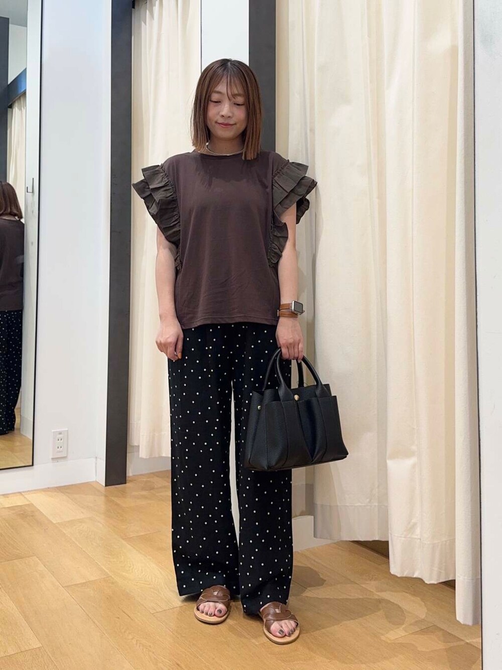 ご覧頂きありがとうございます^^ [トップス] フリルが可愛いトップス◎ お袖も程よくありすっきりみせてくれます! ブラウンはトレンド感アップするカラーで とてもオススメです!