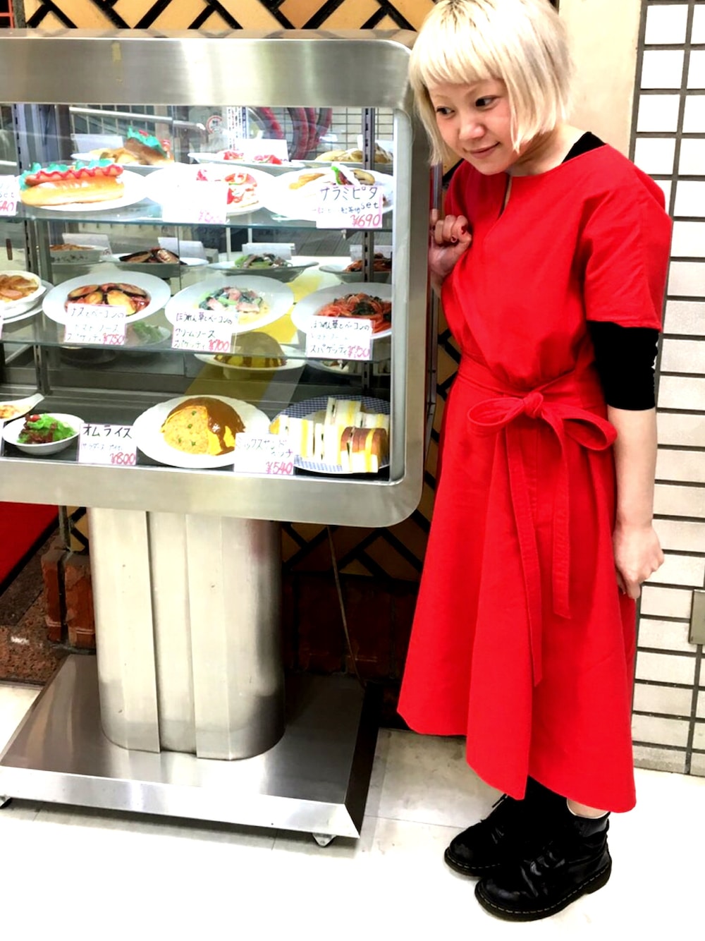 古着で購入した赤ワンピ。 ヒールに合わせてドレッシーに使おうと思ったアイテムだけどマーチンでカジュアルダウン。 三宮サンパル、喫茶mocking bird前。