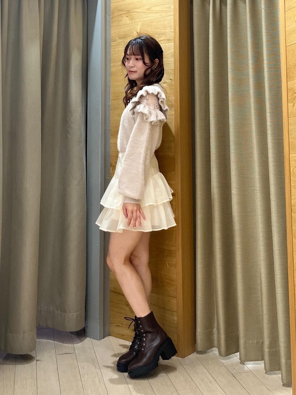 【158cm/骨格ナチュラル/イエベ春】全てMサイズ着用。肩部分のレースとフリルのデザインが可愛い、ガーリーさんにおすすめのニット🥺🎀推しカラーはピンク🩷フリルのあるスカートと合わせてより甘く着るのがおすすめです🤍🎶冬のデートにぜひ着てほしい1枚です![Instagram→@n.h.__75]
