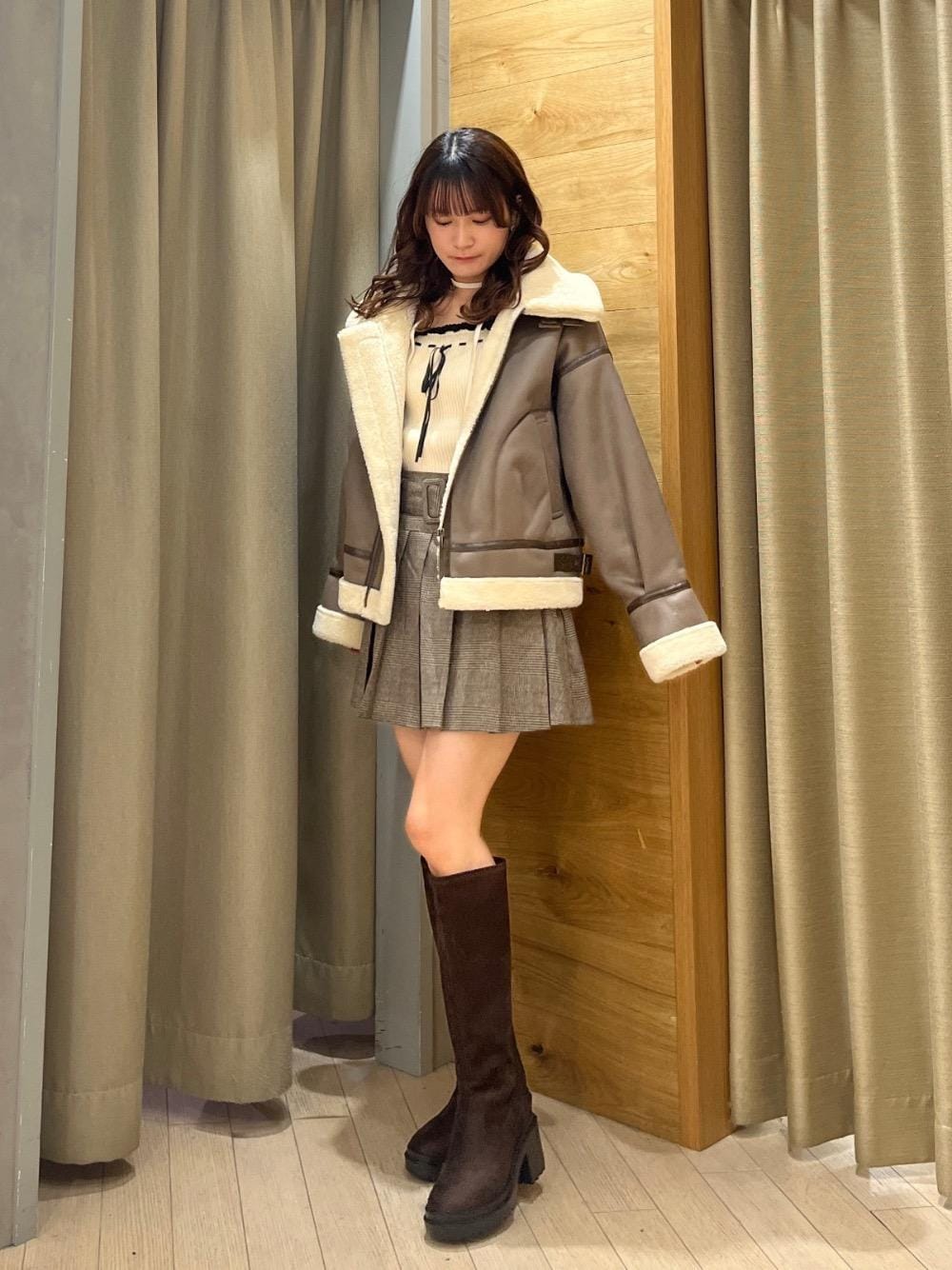 【158cm/骨格ナチュラル/イエベ春】全てMサイズ着用。ブラウン系でまとめたカジュアルガーリーなコーデ🤎🤍アウターは袖までしっかり裏がもこもこしているのでとても暖かいです🥹🎶スカートは太めのベルトがセットになっていてウエストマークしてくれるのでスタイルアップ効果も抜群!!◎[Instagram→@n.h.__75]