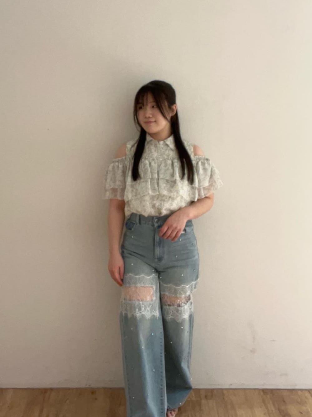 トレンドのデニムを使って大人かわいいコーディネートにしてみました!! デニムは太ももあたりに透け感があり細見えするポイントになっています✨ 小花柄のブラウス合わせでフェミニン感があるので、 カジュアルすぎないで素敵に着ていただけます💓