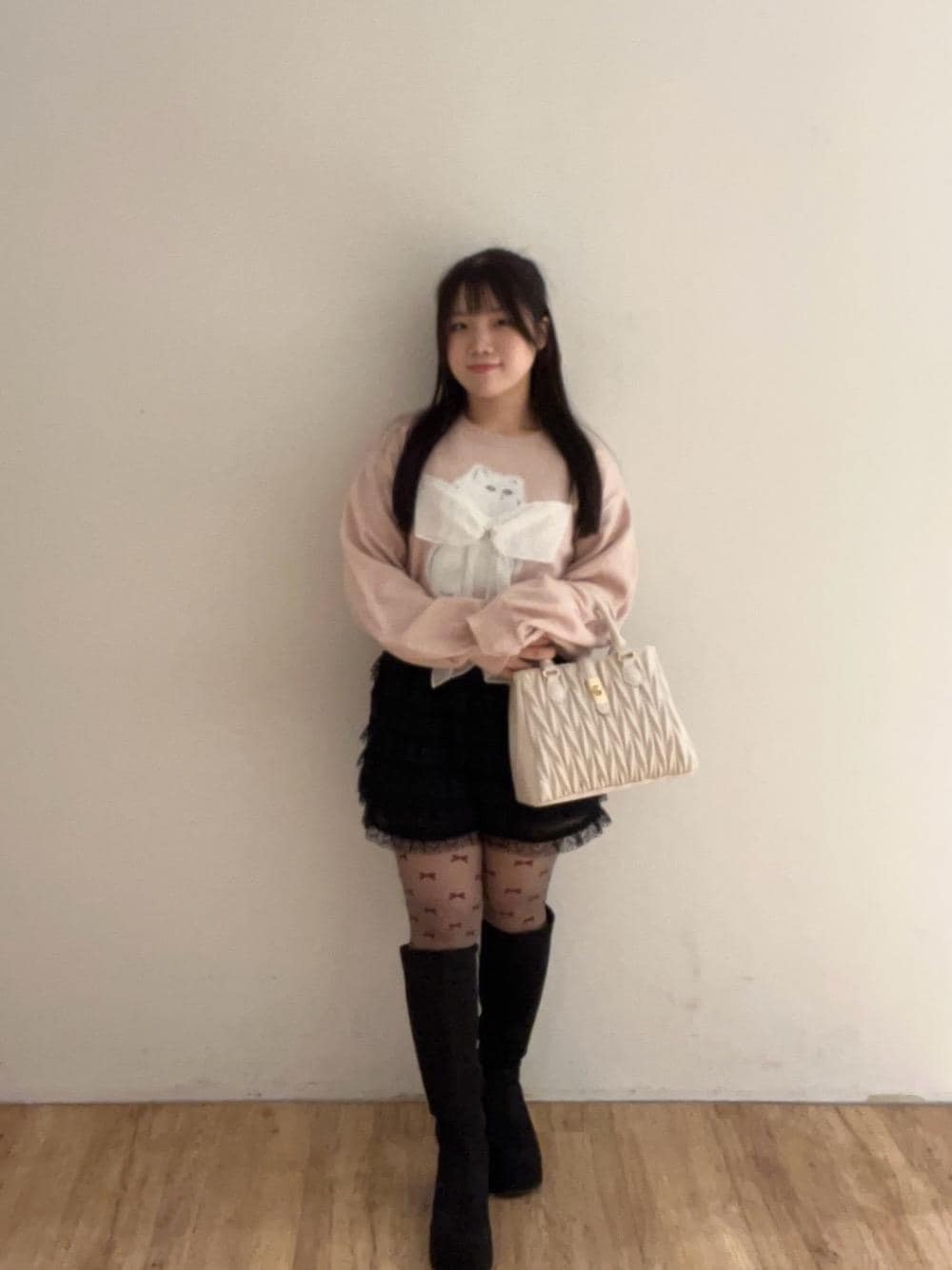 ガーリーコーディネートにしました!! トップスは襟を付けてフレンチガーリーにしても可愛い ネコちゃんニットになっています🐈⬛💗 インパクトのあるトップスなので、これ一枚で楽に可愛いをゲットしていただけます…✨
