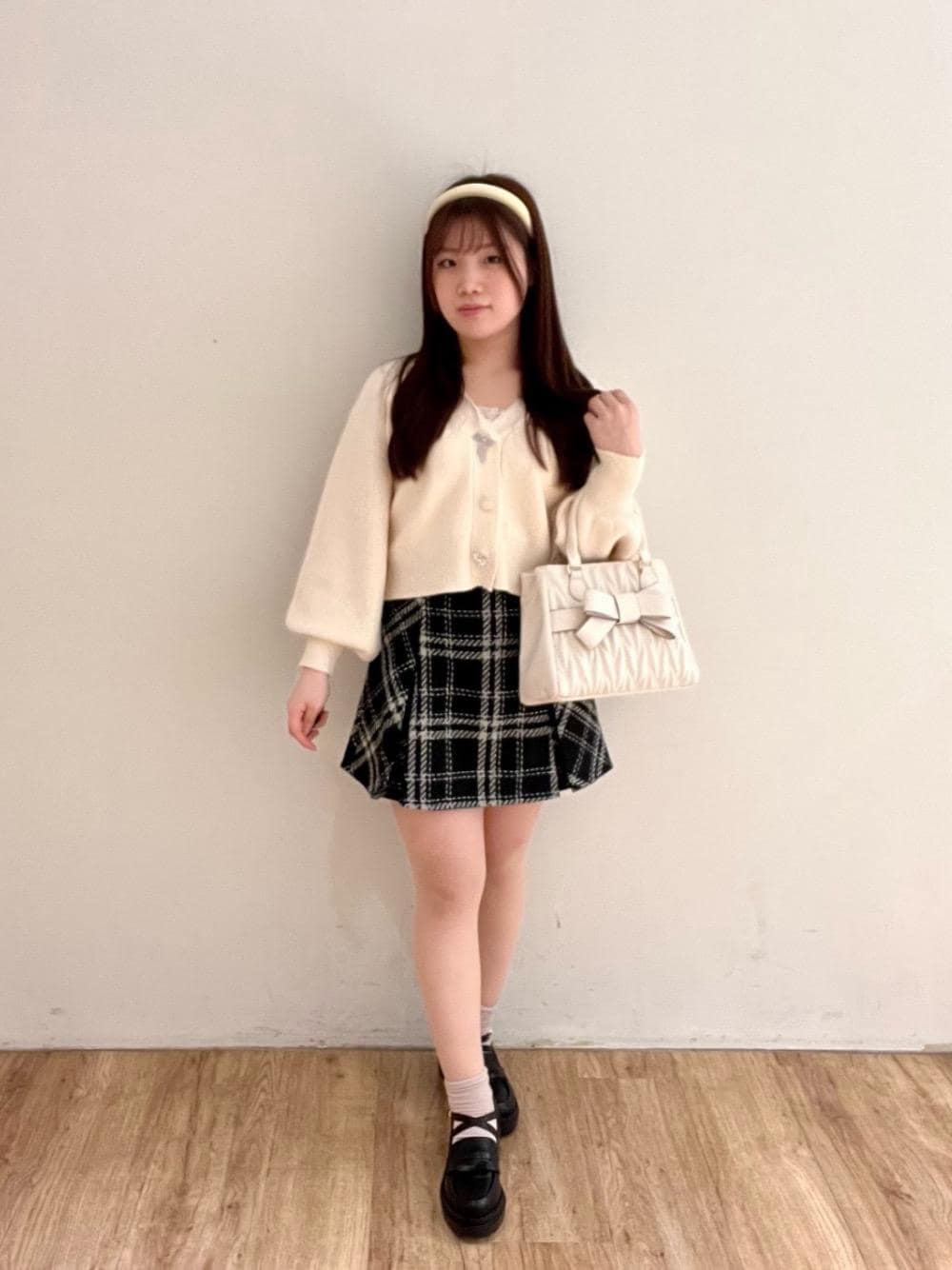 フェミニンコーディネートにしました! カーディガンはボタンがかわいいポイントで、目立つ部分にリボンなのがとてもキュート🩷🩷 デイリー使いも着やすいカーディガンになっています!! スカートは形がよりキレイでフレアなのがスタイルアップ効果になります…✨ 女の子の定番コーディネートです☺️💞