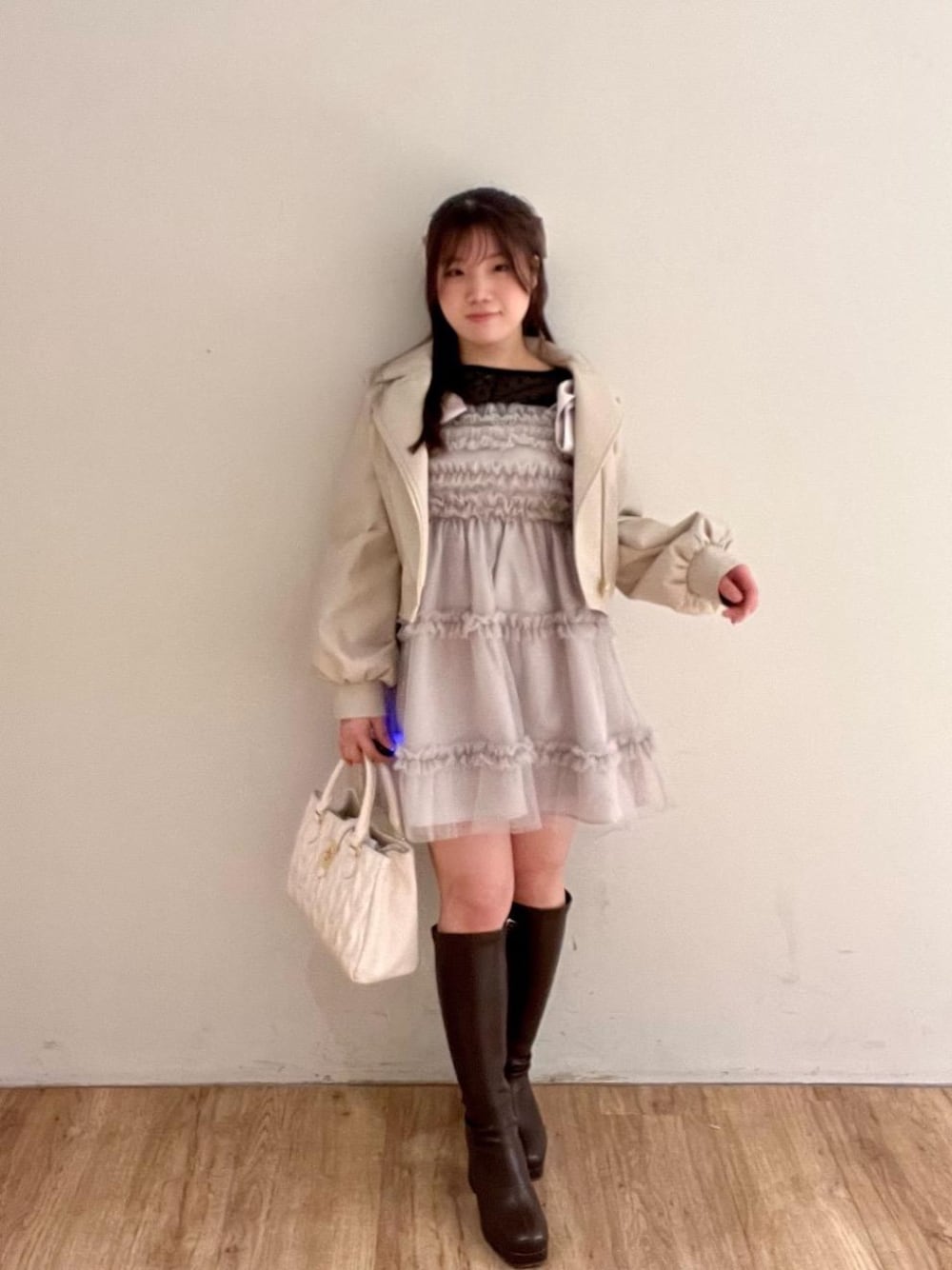 大人かわいいコーディネートにしました❕ チュール素材のミニワンピをメインに、レザー素材の小物やアウターで少しかっちり感を残して甘辛にしました🙌🏻 ✨ ミニワンピの長さは肩のリボン部分で調節可能になっています! アウターを羽織るとリボン部分が潰れてしまうので、アウターを少し落として着るのが◎ ミニワンピはカラーが豊富なので、メンカラコーディネートにしても可愛いですよね😍🩷 着用の物は少しピンク、紫っぽさのある落ち着いたカラーになっています✊🏻💕 メンカラ取り入れたいけど大人っぽいコーディネートにしたい という方におすすめコーディネートです❕