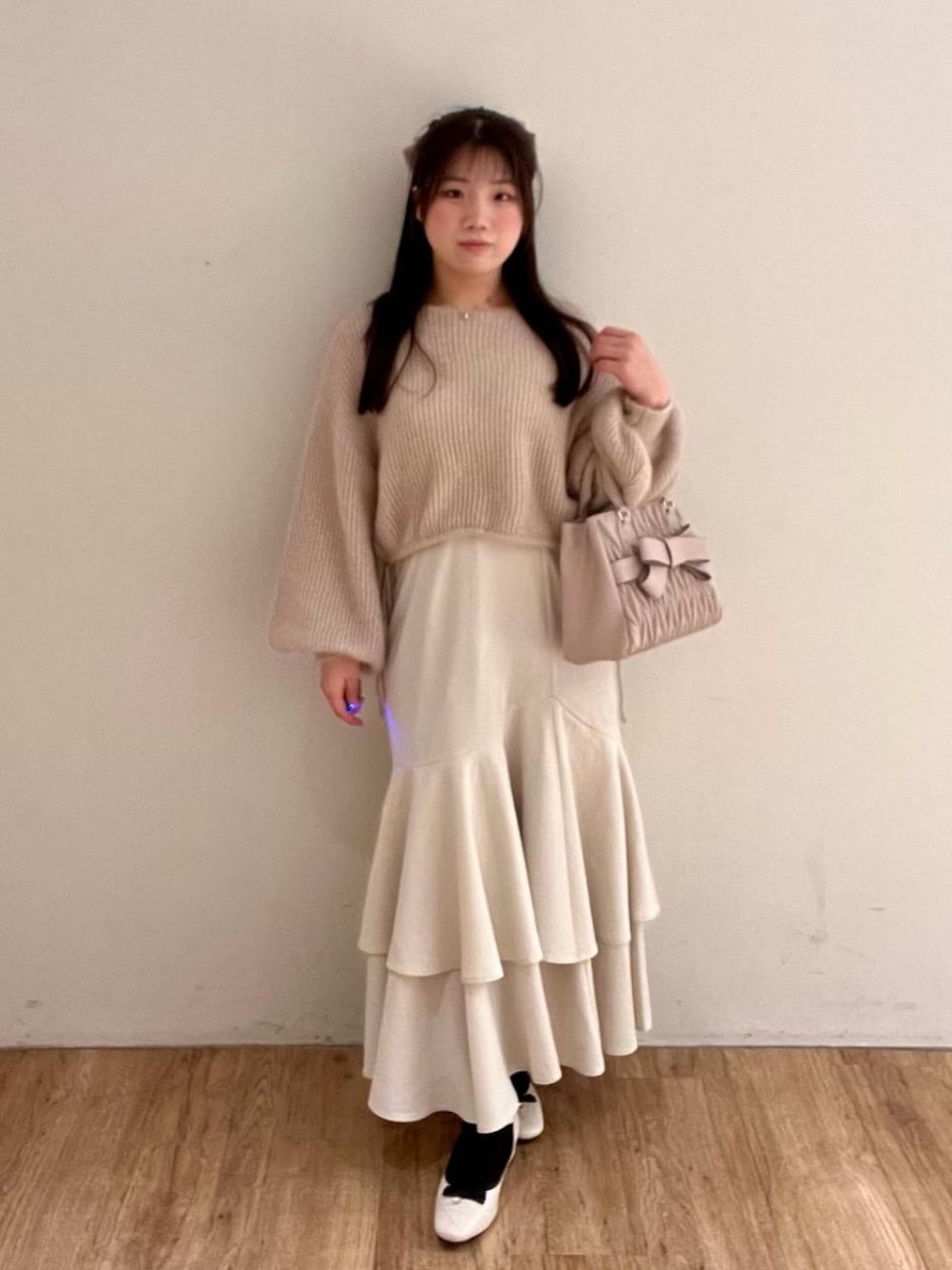 大人かわいいフェミニンコーディネートにしました✨ ニット、スカート両方にラメが入っていますが、 ⇨ニットの方は 程よく派手すぎずのラメ感なので、どんな時でも着やすい物となっています! ⇨マーメイドスカートは 華やかなラメ感があるので、シンプルなトップスと合わせても、オシャレに着こなせちゃいます…🙌🏻💞 パッと見たときの印象だとシンプルなので、小物類で リボンやビジューなど、わかりやすくデザインある物と 一緒にコーディネート組むのが可愛くておすすめです🍒