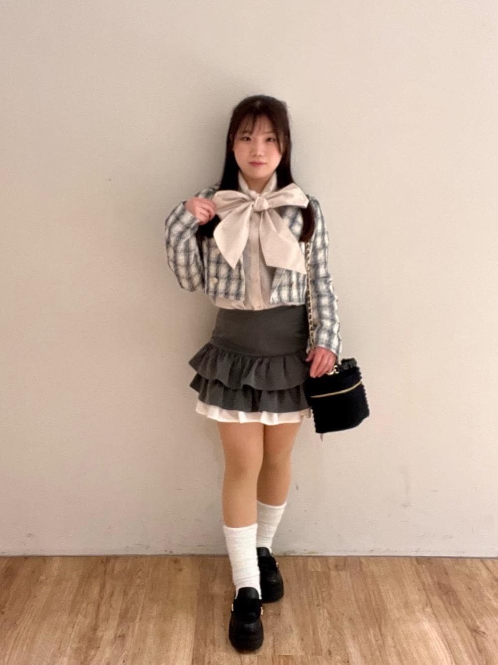 お出かけガーリーコーディネートにしました✨ ボウタイのブラウスはリボンが大きく、存在感があって 女性らしさがあります!!🎀 リボンがコーディネートのワンポイントなので、アウターは首元が開いた物が🙆🏻♀️ そこにミニスカート合わせだとより、ガーリーさが生まれてとても可愛らしく着ていただけます! 推し活やカフェ活などにおすすめのコーディネートです🍒