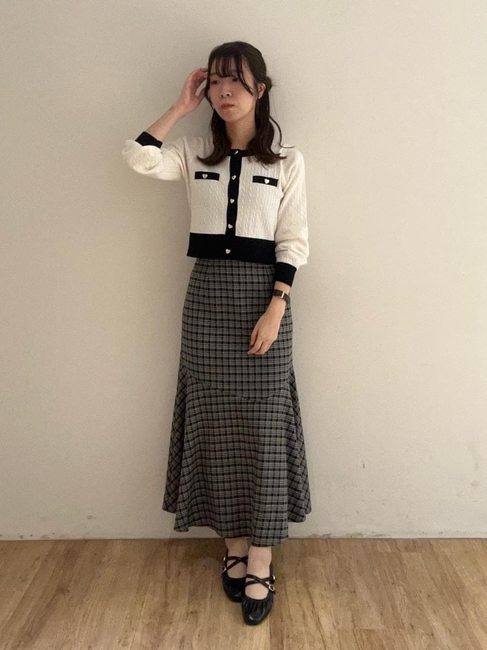 キレイめにまとめたコーデです💐 コーデはハートボタンでキレイめ可愛い雰囲気にまとまります♡生地がもちっとした素材感でこれからの時期にピッタリです🙆♀️ スカートはマジェの定番のマーメイドスカート✨️伸びもよくストレスフリーできれちゃうシルエットが綺麗なアイテムです!