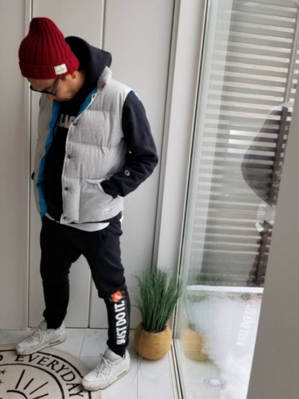 2018年最後のアップはスポーツミックスで! 最近購入したエクストララージのダウンベストは裏地のスカイブルーがお気に入りです。 ナイキのスウェットパンツは細身のジョガーでオレンジがいい差し色でお気に入りです。 ダイソーのニットはコスパ最強です。