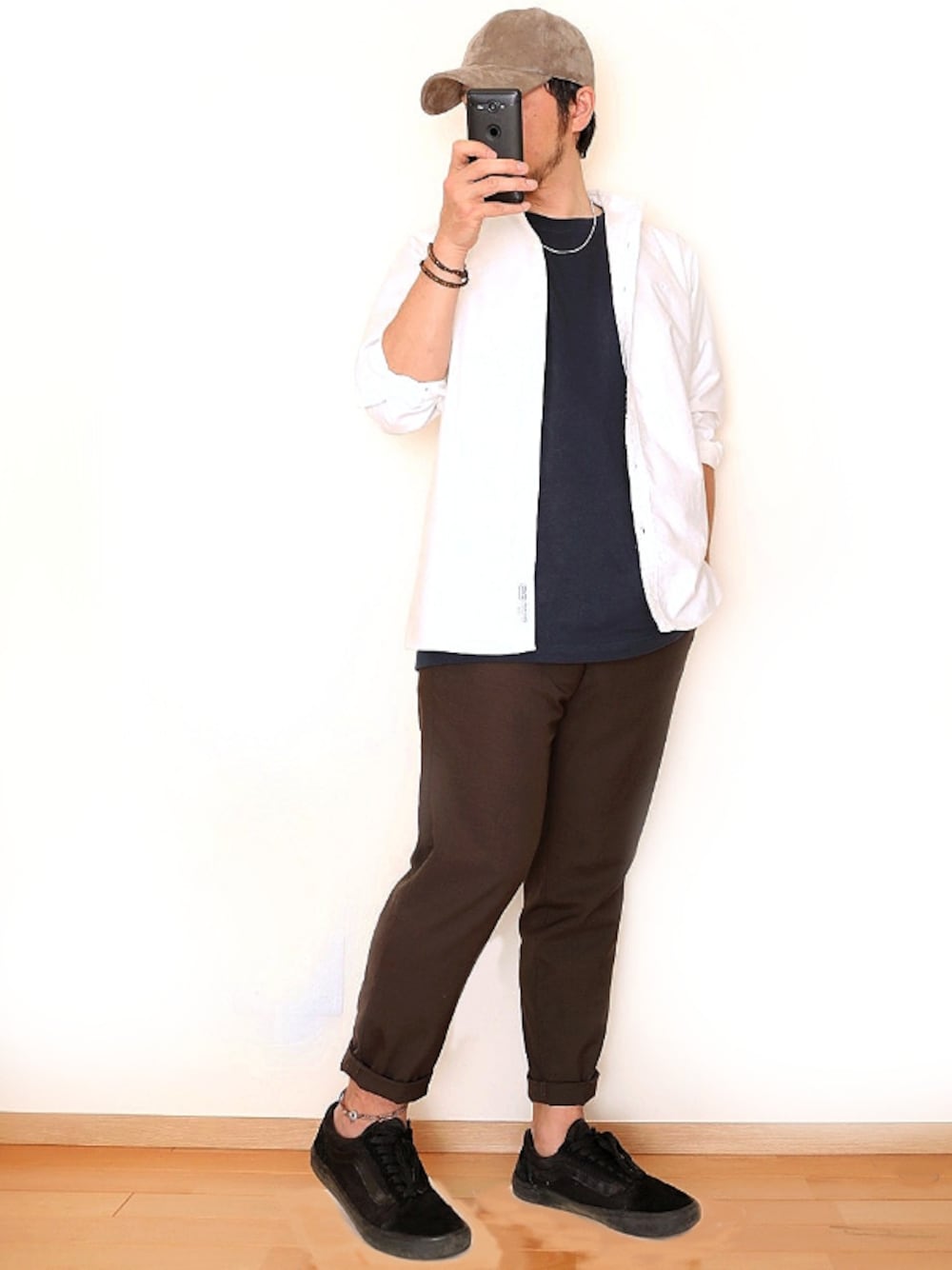ネイビーTシャツ×ブラウンのパンツに バンドカラーの白シャツ を合わせました 足元はロールアップして 足首を出して春らしく シンプルに仕上げました✨