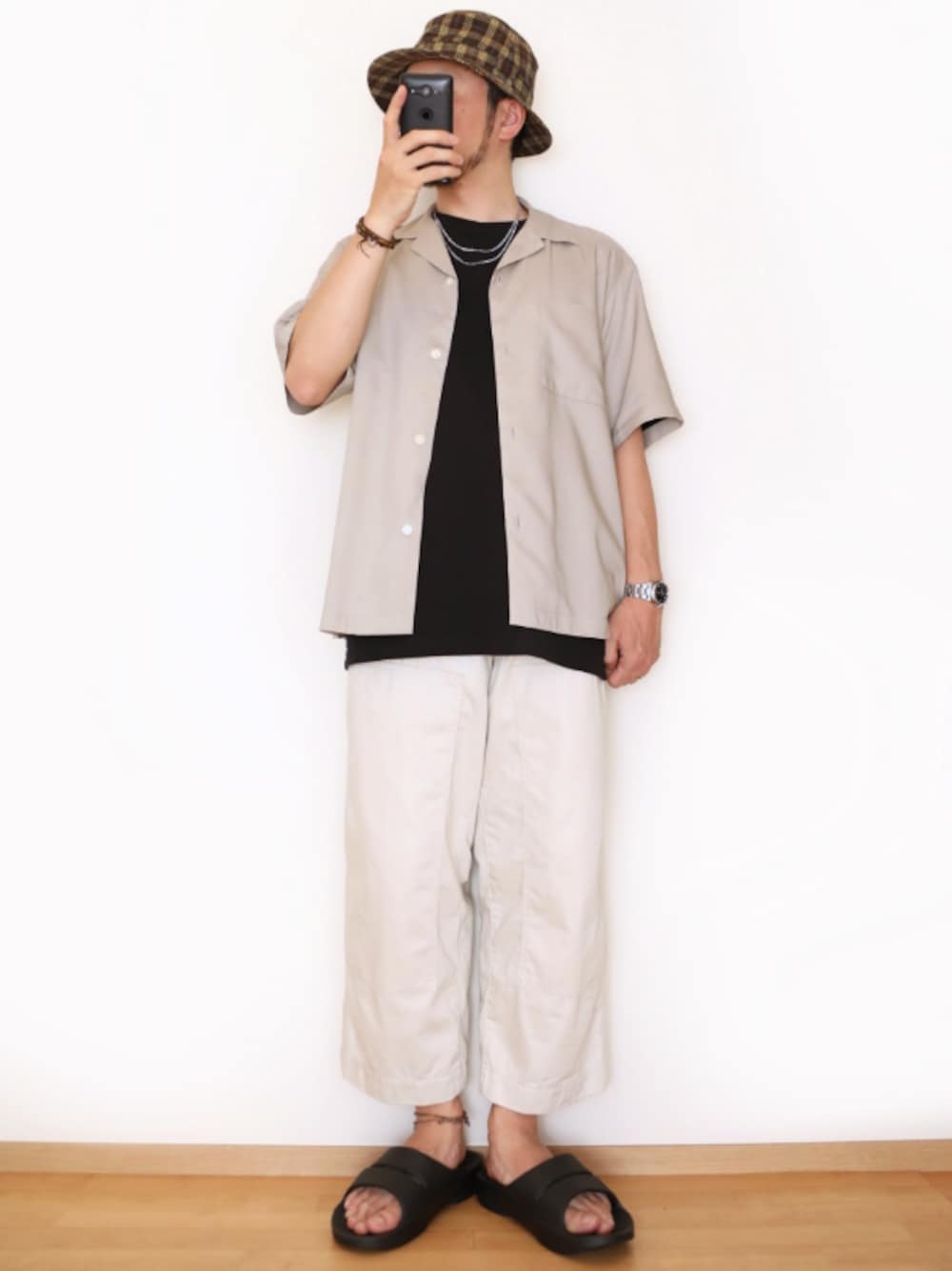 いいね、お気に入り、フォルダイン いつも、ありがとうござます! フォルダインに masakazuさん、にゃん😿さん maiさん、N子さん、Senさん ありがとうございました! 〜コーデ〜 黒Tシャツ×白ワイドパンツに グレーのオープンカラーシャツを 合わせています 足元はサンダルで さわやかに仕上げました✨ シャツ:M Tシャツ:XL 〜コーデのポイント〜 白と黒の ツートーンコーデに アクセントとして チェックのバケットハットを 合わせたり 黒Tシャツに シルバーのネックレスを 合わせたりしています GUのオープンカラーシャツは ゆったりとした作りなので Mサイズにして インナーのTシャツは レイヤードでトップスの裾から 出したかったので XLサイズにしています