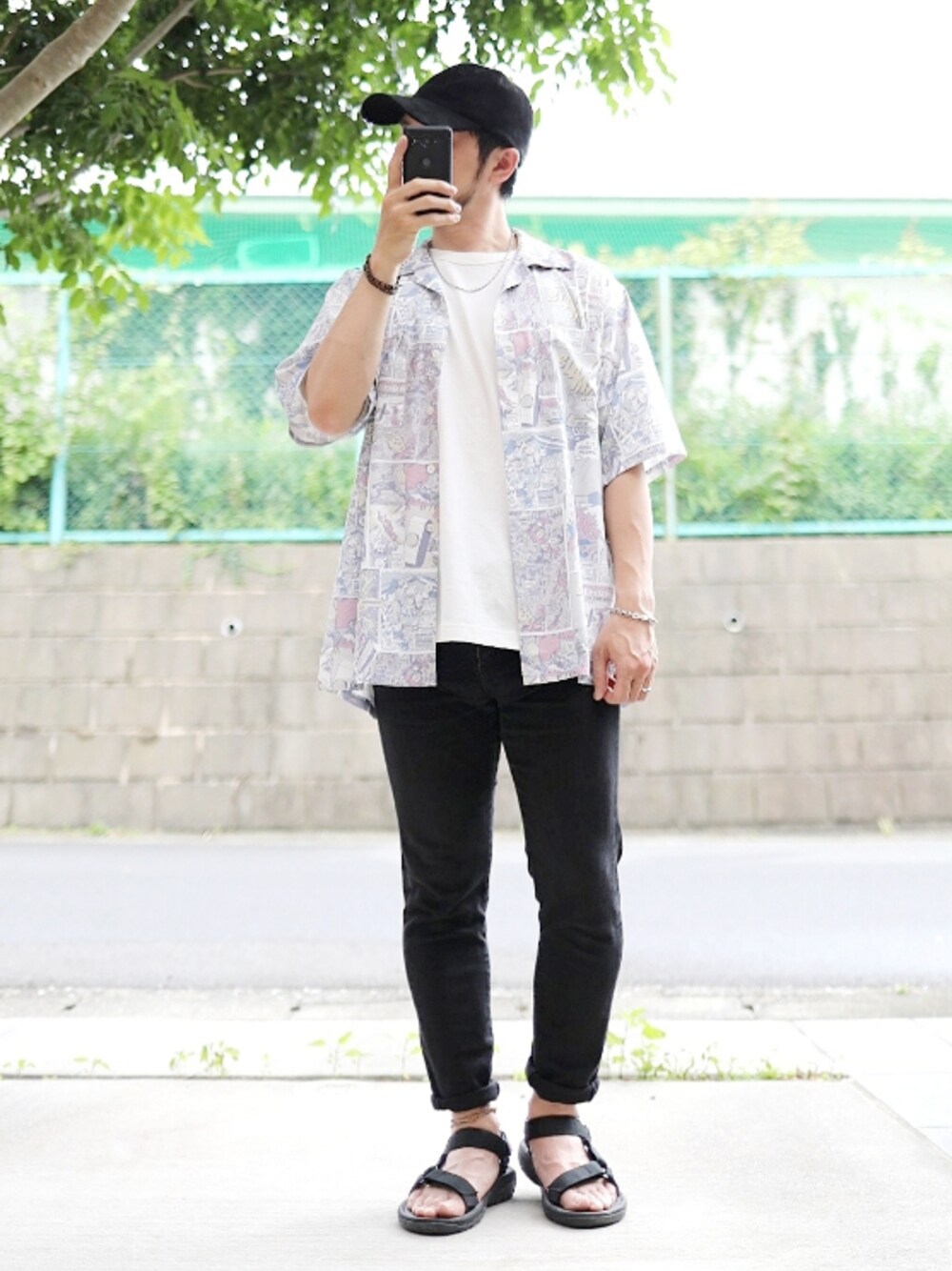 いいね、お気に入り、フォルダイン いつもありがとうござます! フォルダインに masakazuさん、N子さん、Takaさん ありがとうございました✨ 今回は初めて 家撮りじゃなく、外で撮影して 投稿してみました😂 基本的に投稿は 背景を揃えていきたいと思っていますが たまにはいつもと違う投稿がしてみたい と思い撮影してみました📸 色々な人の投稿を参考にして wearっぽく(笑)撮影してみました😋 〜コーデ〜 白Tシャツ×黒スキニーデニムの シンプルなコーデに インパクト抜群の マーベルのキャラクターがプリントされた オープンカラーシャツを合わせています 足元はロールアップして スポーツサンダルで すっきりと仕上げました✨ シャツ:M Tシャツ:L