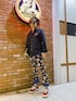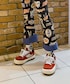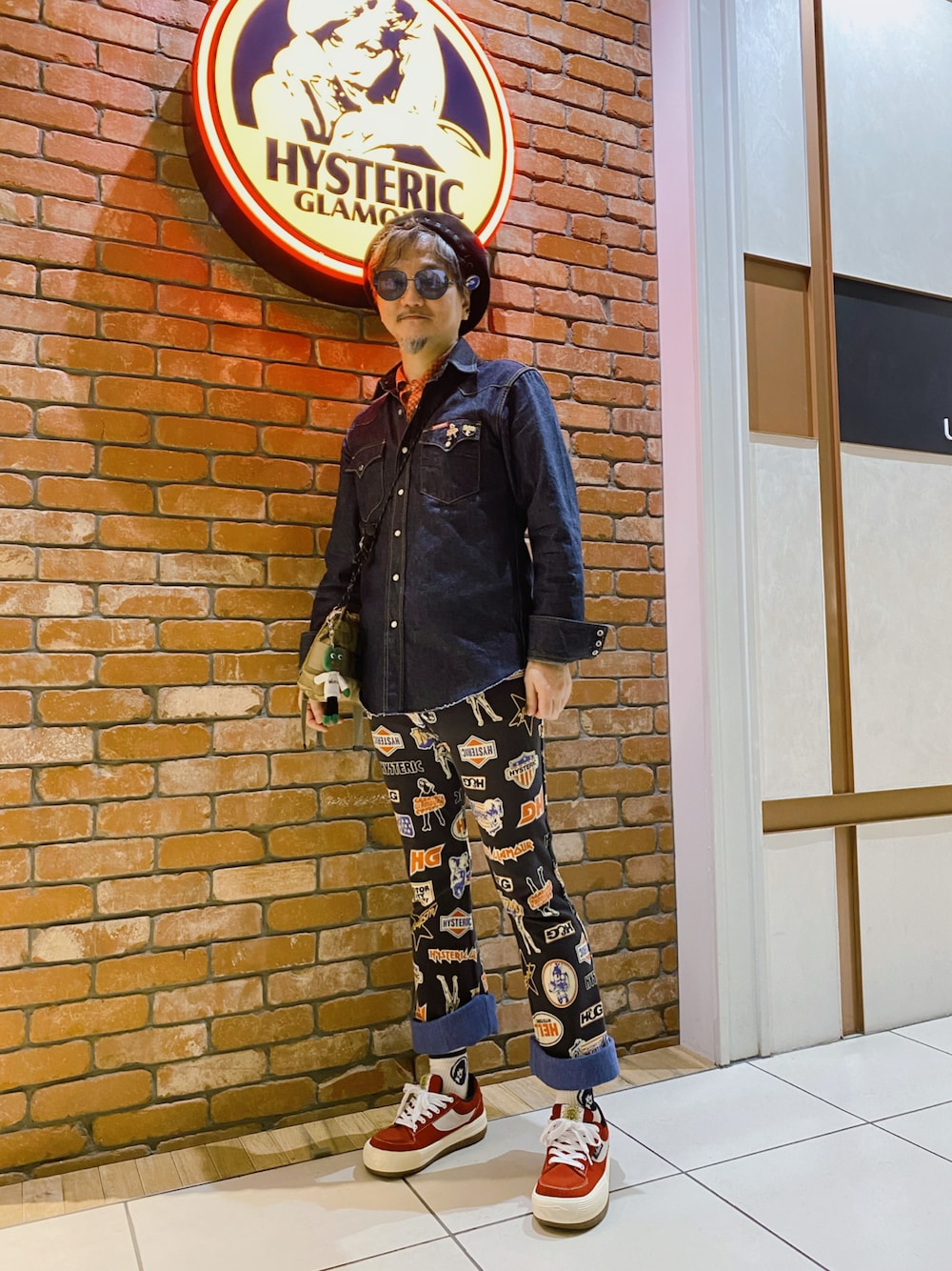 いつもいいね!ありがとうございます😊 WEARを始めて丁度2周年経ちました❗️ お気に入りのアイテム達を総動員して 気合い入れてみました!笑 ヒスの総柄リバーシブルフレアパンツをロールアップしてクロップドパンツにアレンジ。 リバーシブルなので裏のデニム柄が裾に出てくるから、トップスに同じ色見なデニムシャツを持ってきてインナーを差し色の赤シャツでレイヤード。 足元には丸っこいシルエットが可愛いNorthwave ESPRESSOを履いてみました。 このパンツ、スエット生地だから裾がフナャってなっちゃうので、ヒスの黄色いショッパーを切って丸めて裾の中に入れてみた。 あと、帽子のピンズと背中の刺繍と靴下をサークルガールに合わせて、胸にもビクセンとアフロのピンズを取り付けて、ズボンの柄を少しづつ全身に散りばめてみました。 色々と工夫したおかげで、全体的にスッキリしたthe HYS感タップリな2周年記念コーデになった気がする〜❣️