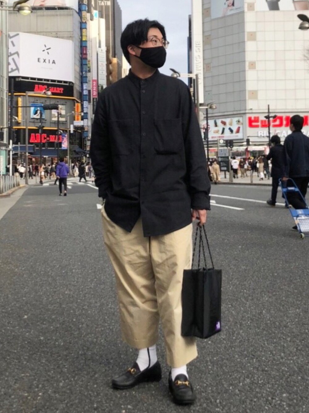 春の休日コーデです🤵♂️ 黒シャツにベージュのパンツを合わせました✨ パンツはスタジオニコルソンのもので、アンクル丈なのでカジュアルな印象です◎ ラインソックスをチラ見せしています✨ 足元はGUCCIのビットローファーでキレイめに😉