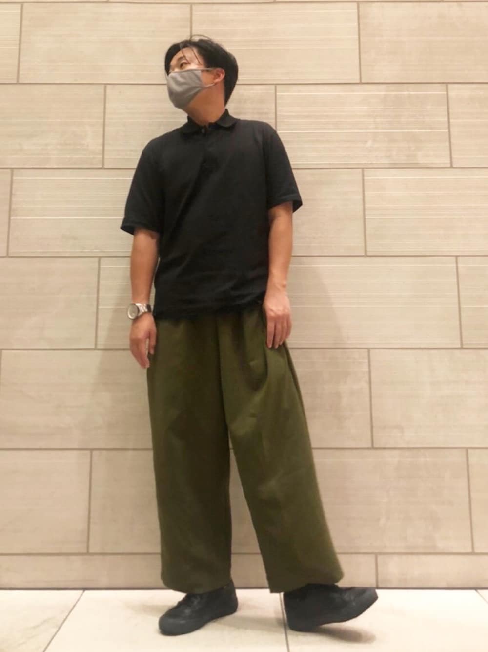 黒のポロシャツにカーキのワイドパンツを合わせてカジュアルに✨ パンツのシルエットはかなり太めのワイド◎ 足元はスペルガのスニーカーで、カラーはブラック。 レザーですが履きやすくて気に入っています✨