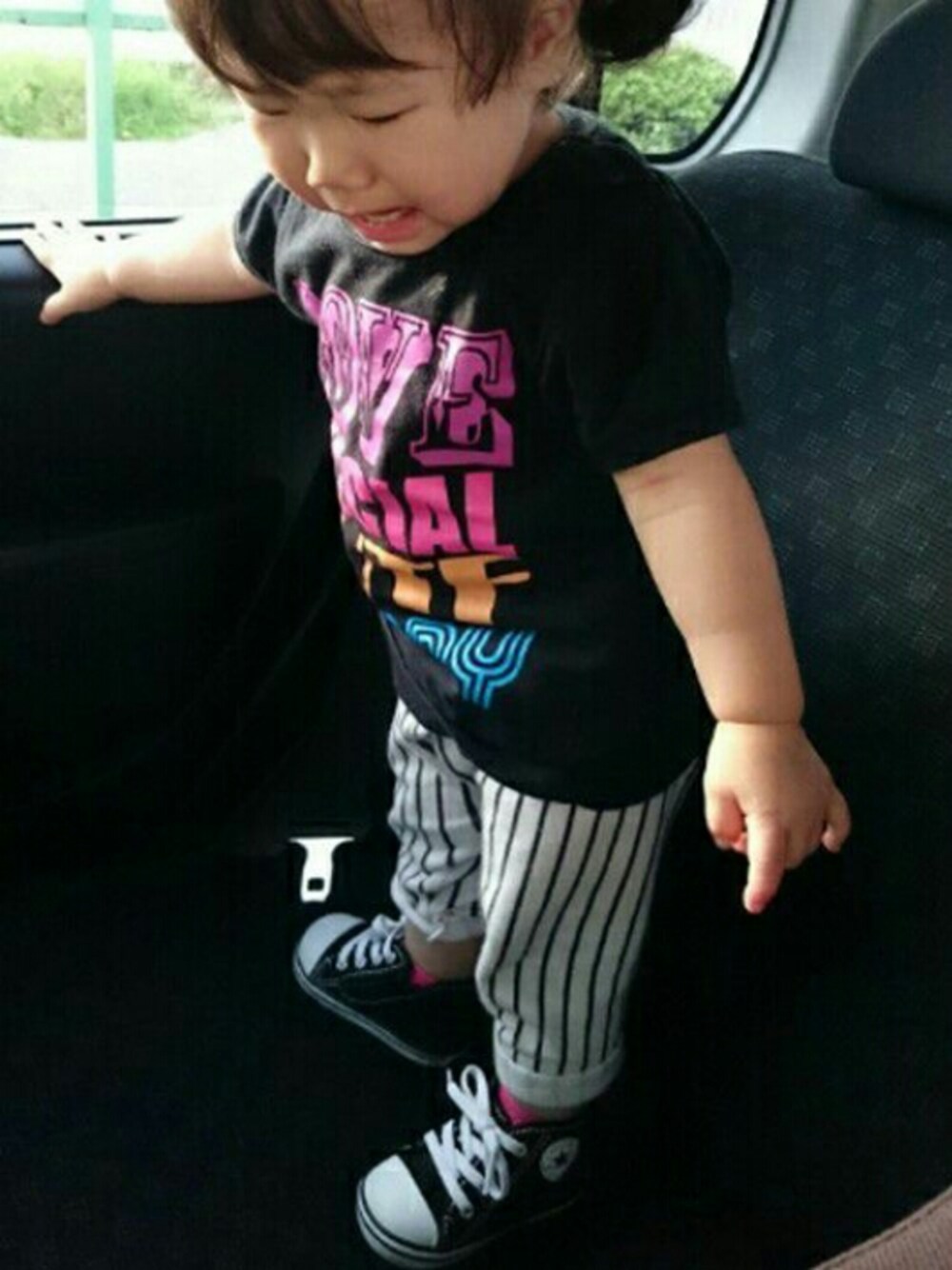 保育園の帰り、靴をはきたいと 暴れていたので車🚗の中ではかせてみた… 靴をはいてもまだ暴れる… とりあえずパシャッっと📷 保育園コーデにハイカットスニーカーをはいただけというショボショボコーデですが…💦💦 HCKフェス参加させてくださーい🎶 主催者さまよろしくおねがいしまーーすm(。_。)m 母もCONVERSEのハイカットが好きで♥ はいております!! なぜか色あせた風に写ってますが…真っ黒のスニーカーでございます💦💦 いつものぞいてくださりありがとうございまーす💓