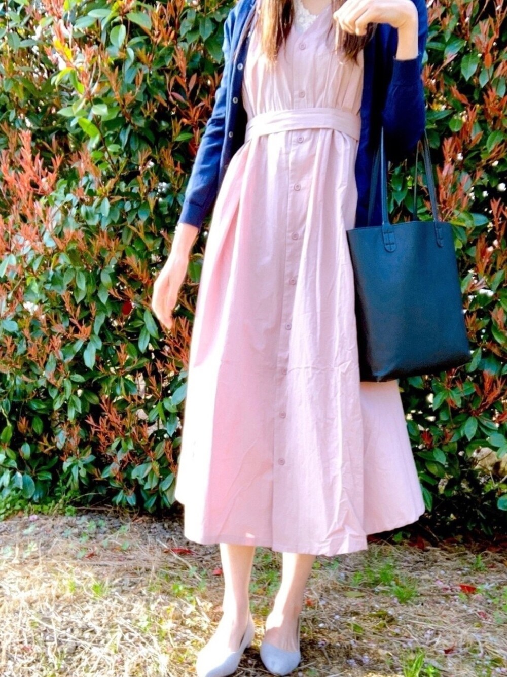 手が謎…🤔 ワンピースの甘さをさらに抑えて 大人なコーデにしました! カーデをネイビーにするだけで上品に。 ピンク×ネイビー好きです。 (同じワンピばっかり投稿して、なんか、まちがいさがしみたいになってますね笑)
