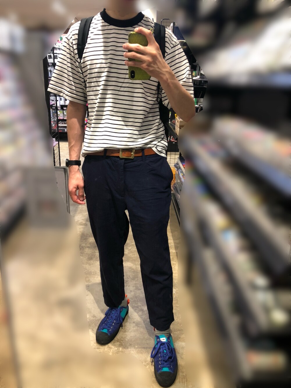 ボーダーに、ネイビーのアンクルパンツを合わせてみました。 靴は、黒よりも青の方が爽やかさが出るかな と思いました。