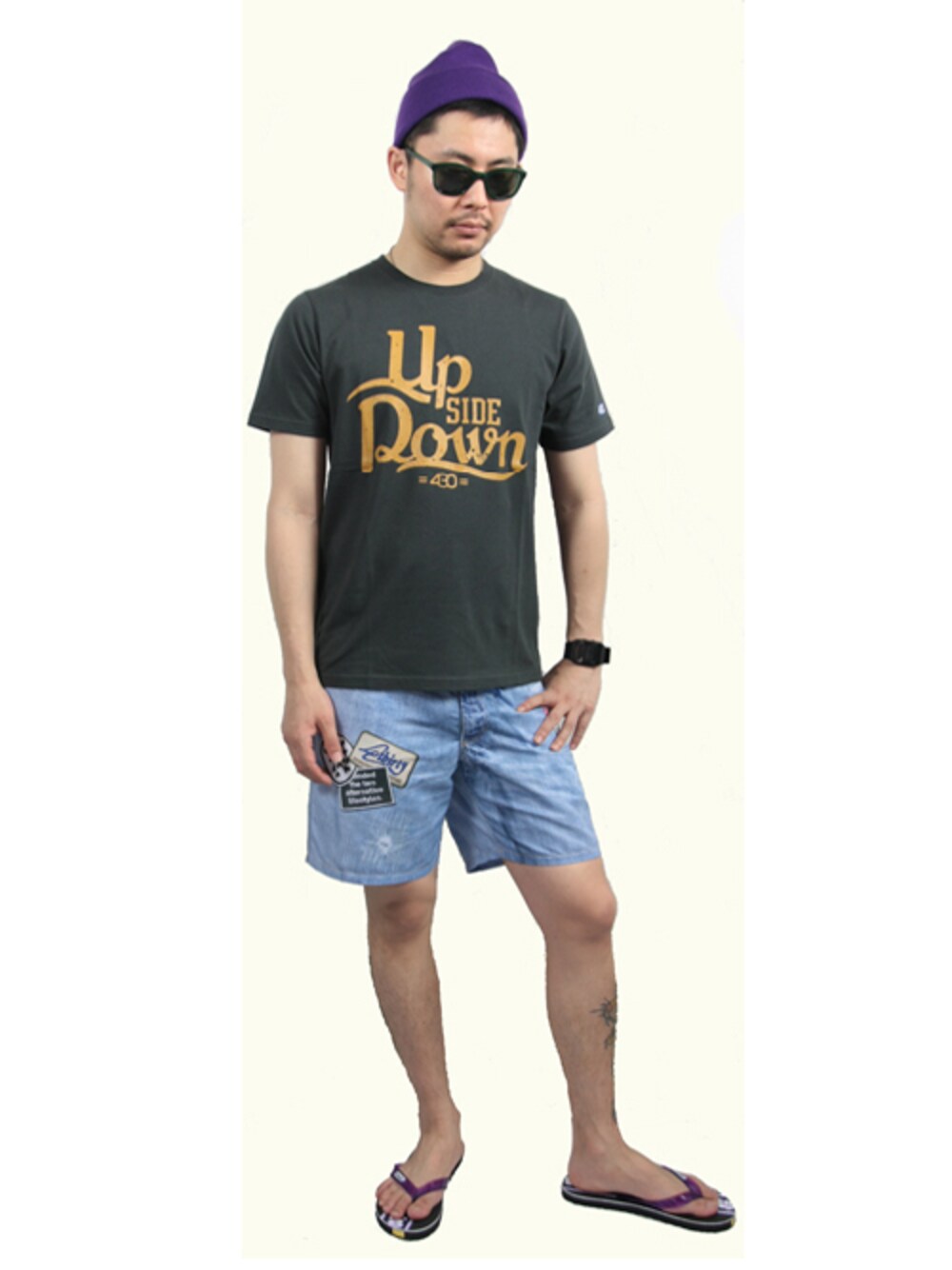 派手目のプリントのTシャツを使ったビーチスタイル。