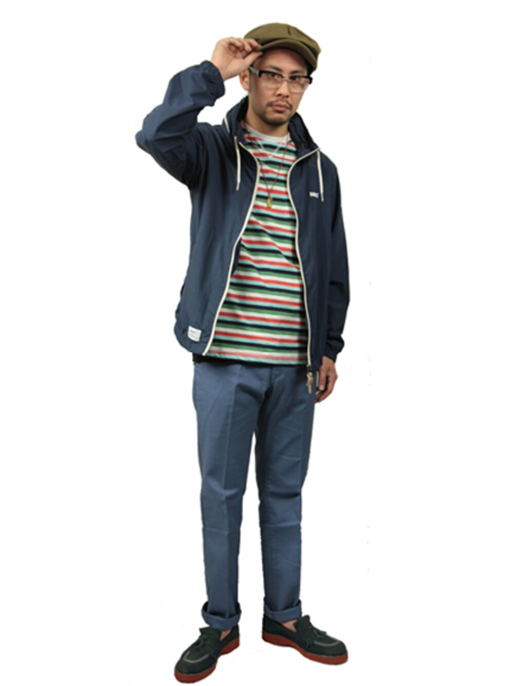 ・カジュアルワークスタイル。 ポイントは上着にスポーティーなトップスを仕様する事で、ややカジュアルな雰囲気に。 Tシャツもパンツのシルエットに合わせて、ジャストサイズを仕様。