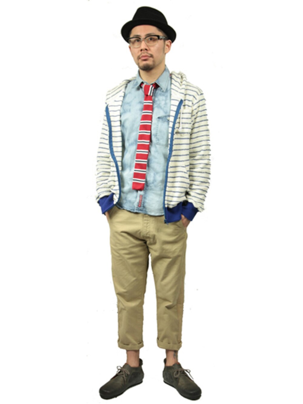 ・ハット、ネクタイでカジュアルかつ綺麗目コーデ。 九分パンツと小物を仕様することでよりにカジュアルな印象に。