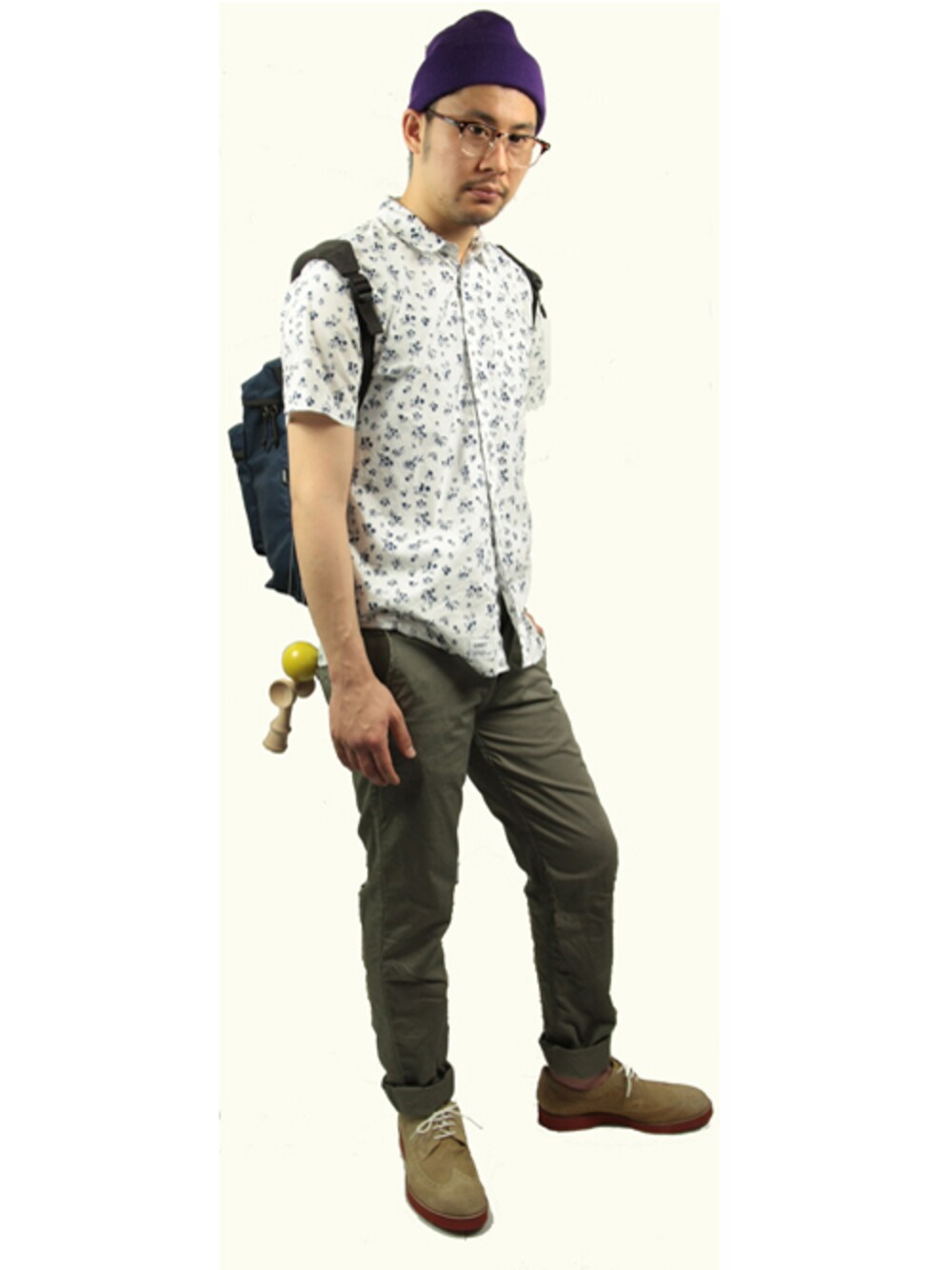 シックな色のパンツと柄白シャツで。 小物でアクセントをつけました。