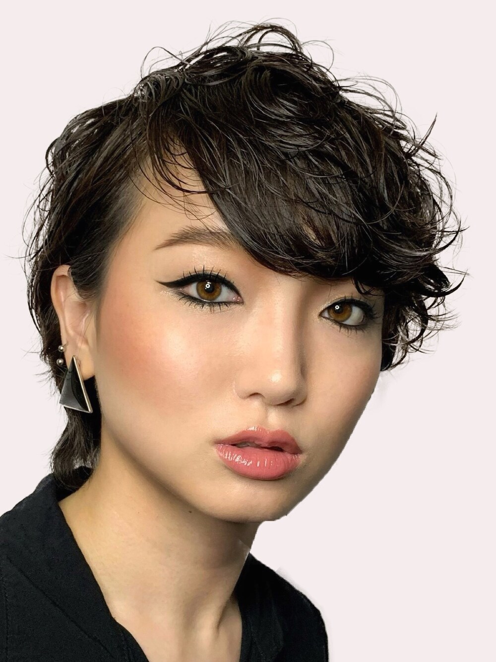 シックな黒ラインで無敵の目元へ。まぶたと涙袋は明るいベージュのアイシャドウできらめかせ、洗練された雰囲気に。(ウォータープルーフアイライナー&アイシャドウ使用)