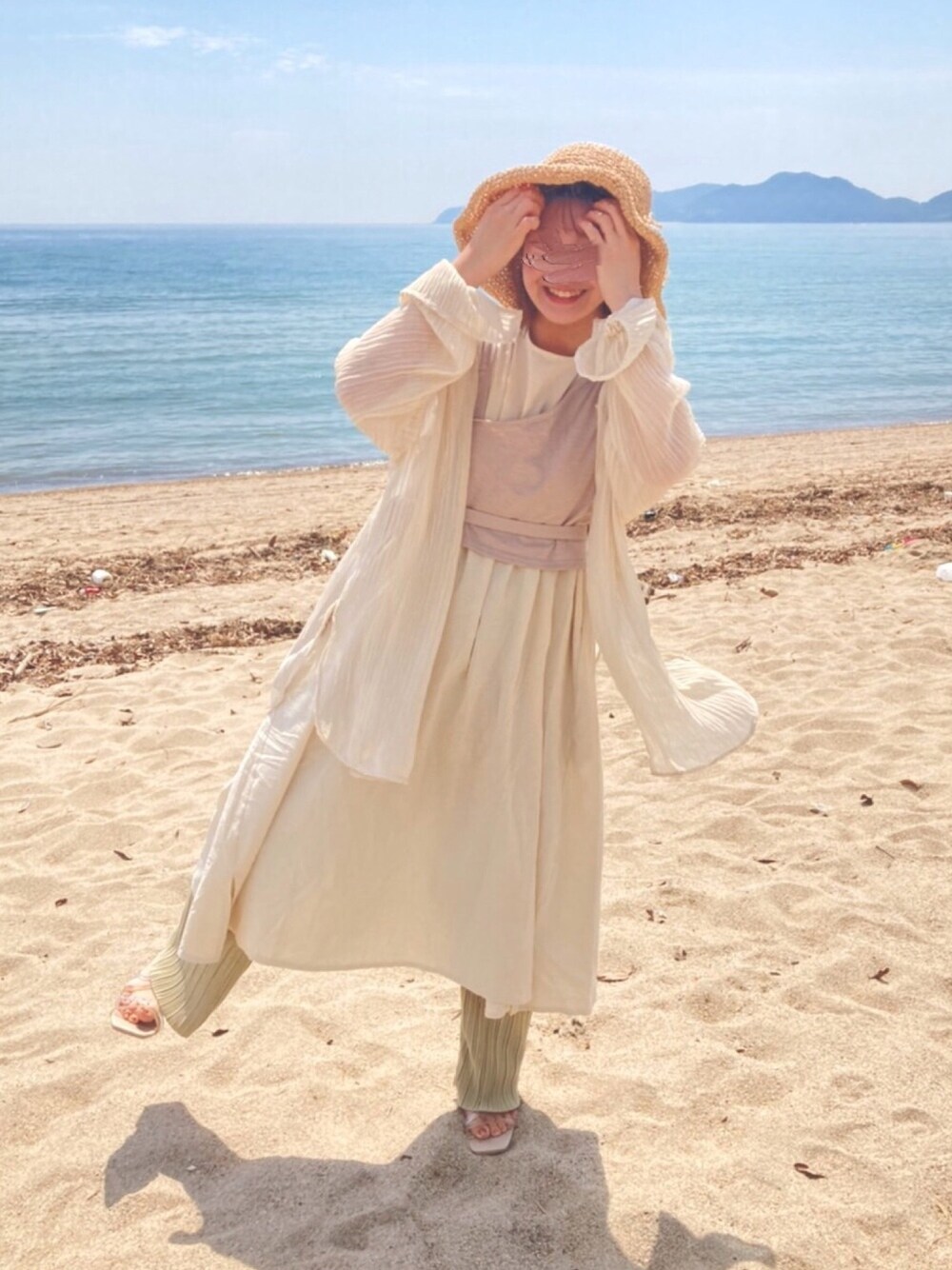 andj の キャミソールを ノースリーブワンピースに 🤍 同じアイテムでも 羽織るの と 巻くので 雰囲気が変わります 🦬⸝⋆