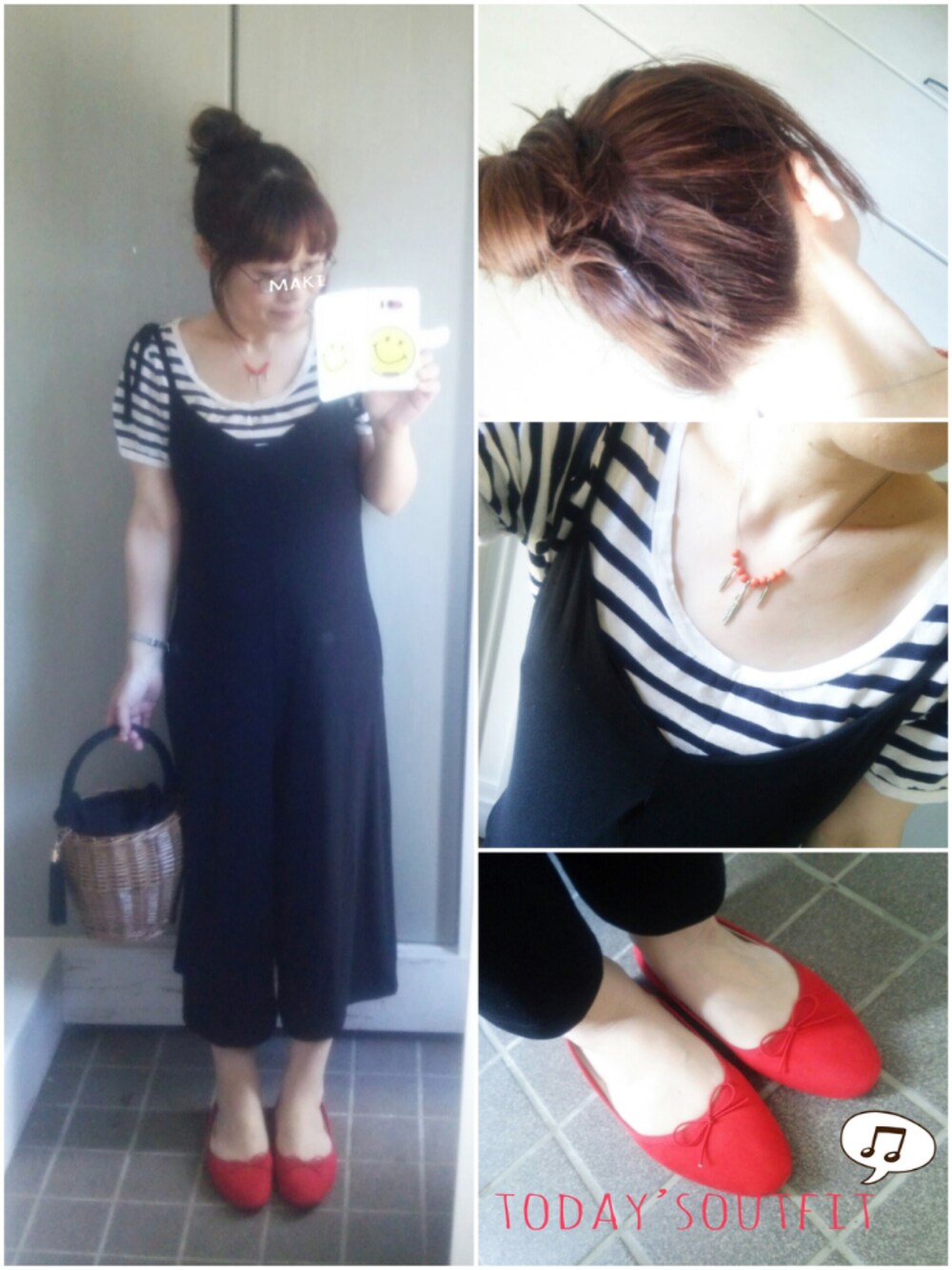 ボーダーにキャミサロペット重ね❤ モノトーンに赤でアクセントにしました🌟