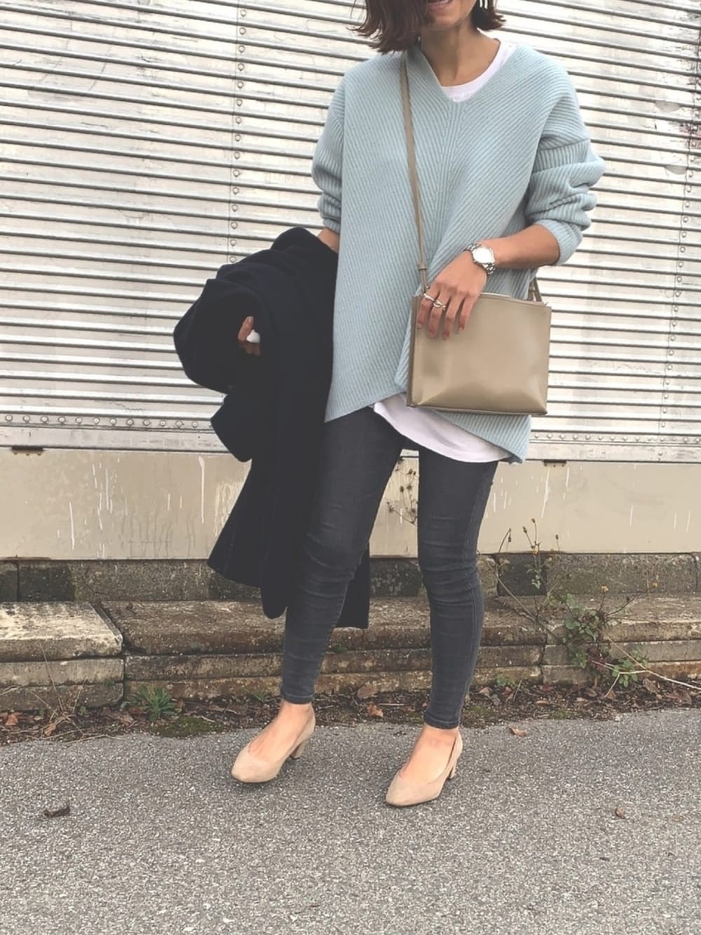 昨日ははあったかい感じだったから日中これで❤︎ このニットのブルーの感じが使いやすかった❤︎