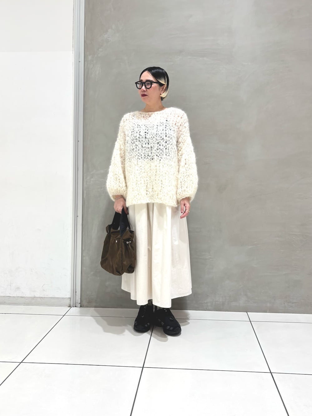 こんにちは🍄 ご覧いただきありがとうございます‼︎ 本日はwhite×blackコーデです🕺 【ニット】 ふんわりと軽やかで、一枚で主役になるハンドニット。 ジャンボタムという日本の糸をざっくりとゆるく編んだハンドニットです。 モへヤブレンドの柔らかな素材に、透かし編みを施し、軽やかな印象に🧶 ゆったりとしたオーバーシルエットとドロップショルダーが、着るだけでこなれ感を演出し、ボートネックのようなネックラネックラインは、デコルテを美しく見せながら、上品な雰囲気に💯👍 【スカート】 コットンのナチュラルな風合いと、程よい光沢感が上品さを添えるボリュームスカート。 軽やかでありながら、ハリのある素材が美しいシルエットです🙂↕️ ウエストは総ゴムにドロスト仕様で、締め付け感がなく快適な穿き心地で、たっぷり入れたタックギャザーは、腰回りがすっきり見えるように計算されているので、体型を気にせず着用出来ます👏 全体的にふんわり、可愛らしい雰囲気に NIKEのAIR MAXのゴツめだけどスマートな形がカジュアル過ぎないアクセントになります。 是非、ご参考にして頂ければ幸いです😆 ありがとうございます☺︎
