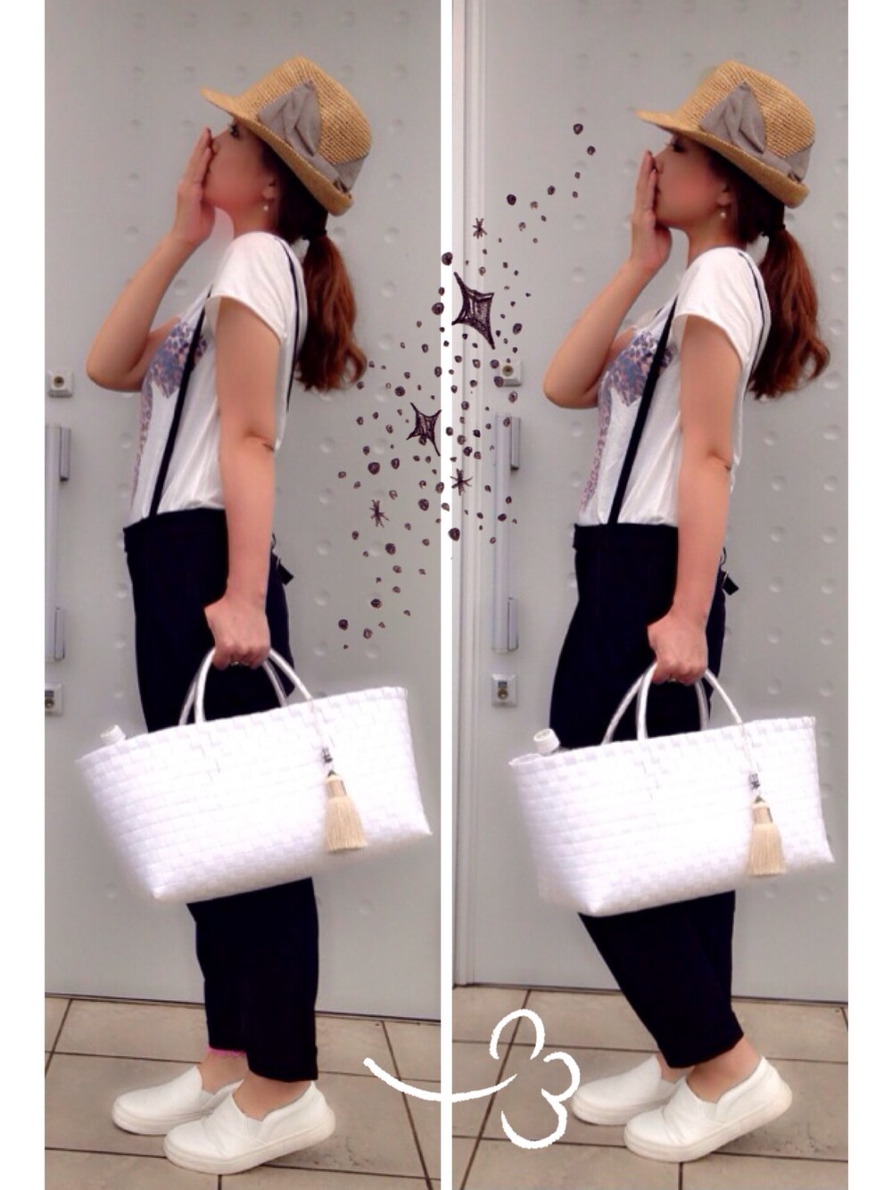 Tシャツ☆ジュエルチェンジズ パンツ、帽子、シューズ全てアクアガール カゴバッグ? テープバスケット?どっちにしても夏にしか使えないから沢山使う♡タッセルが大人ぽくて濡れてもオッケーで重宝してます♡ これはアローズ。 めちゃ雨降りだけど写真のためにハットをかぶり…わらける⁝(ृʾ́꒳ʿ̀ ृ )ु⁝