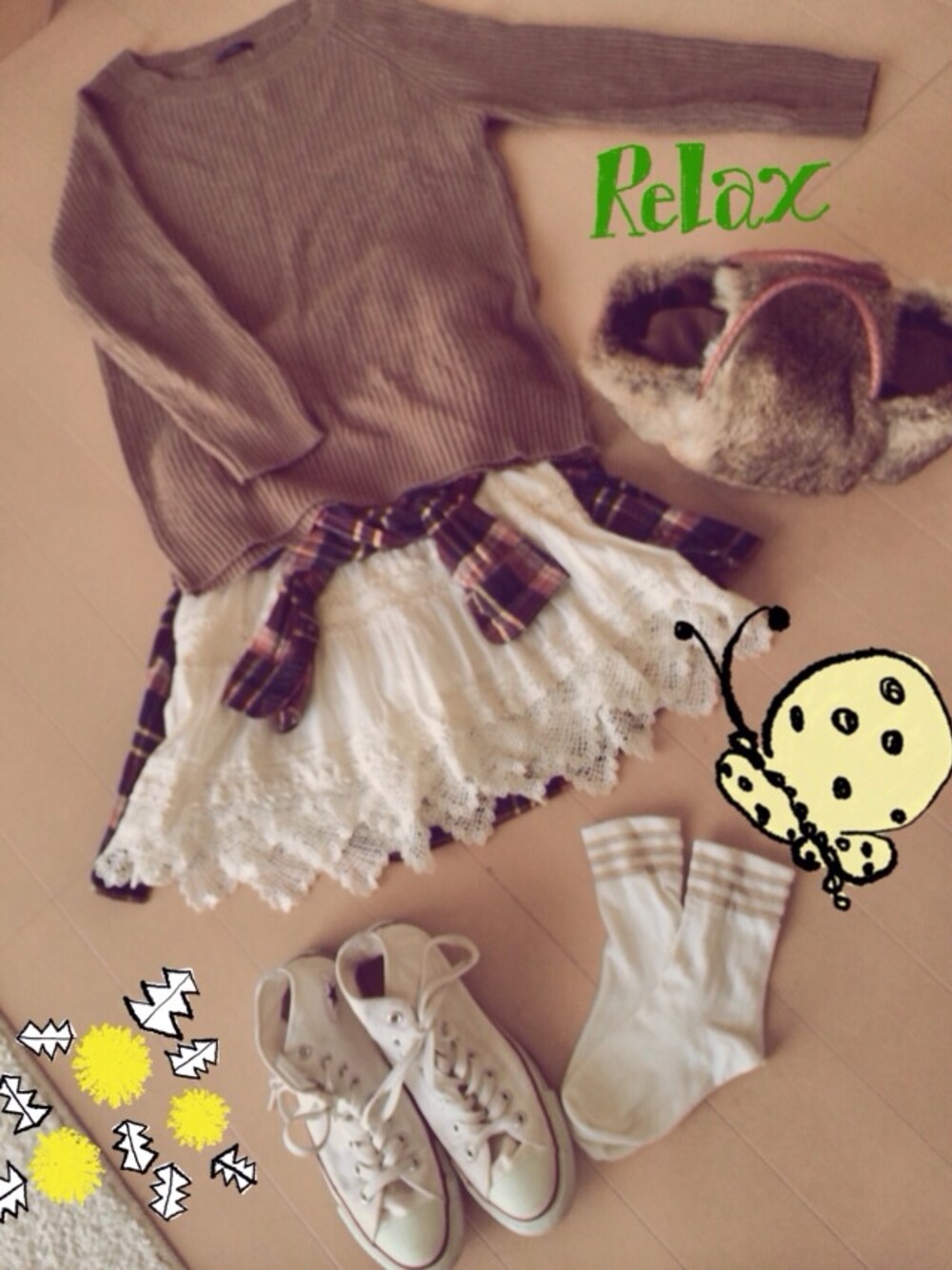 トップス☆ロッソ レースのスカート☆ジュエルチェンジズ バック☆スピックアンドスパンのクプクプのファー籠バッグ ポカポカ入学式の様子が待ち遠しいです! 今日はノーメイクだったので着用せず撮ってみた♡