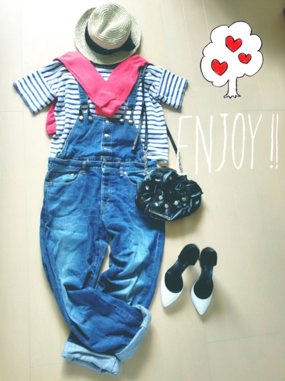 バック☆FIORELLI ハット☆アクアガール オーバーオール☆スピックアンドスパン パンプス☆ビューティーアンドユース トップス☆グリーンレーベル オーバーオールに麦わらハットをかぶってスニーカ履くと完全に農婦になってしまうため、、パンプスで赤いカーディガンを羽織って女子力あげてみた(๑╹ω╹๑ ) ブルーボーダーのカットソーと赤いカーデがマリンテイストに♪