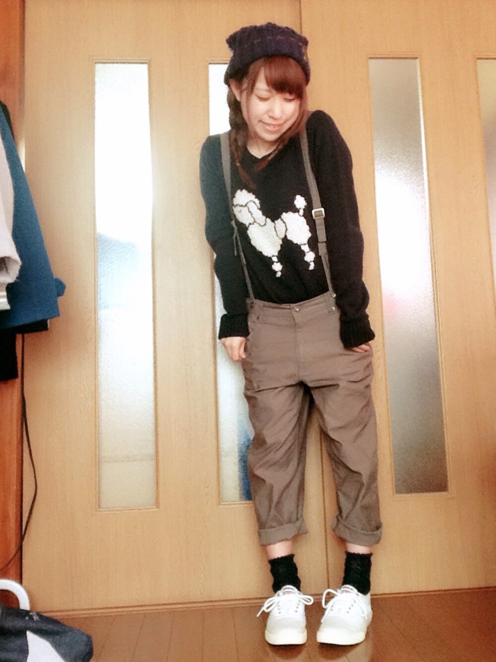 新しいスニーカーが届いたので 試しに履いてみました(^ ^) お気に入りのプードルが目立つ シンプルでカジュアルガーリーな コーディネートです ニット帽は大きいポンポンとボタン ステッチが入ってて 可愛らしくて愛用してます♪