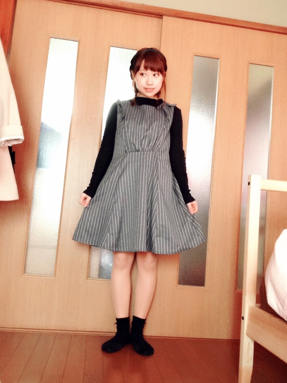 今日はお出かけするんで マジェのお気に入りワンピースです♡ 肩のフリルが可愛くて ガーリーな感じです(*^ω^*) 白いブラウスと白ソックスで いつもは着ていたんですが 今日は雨で靴下汚れちゃ嫌なので 黒でまとめてみました! 髪は編み込みと見えにくいですが 緑のカチューシャしてます♡(*´・ω・)(・ω・`*)♡