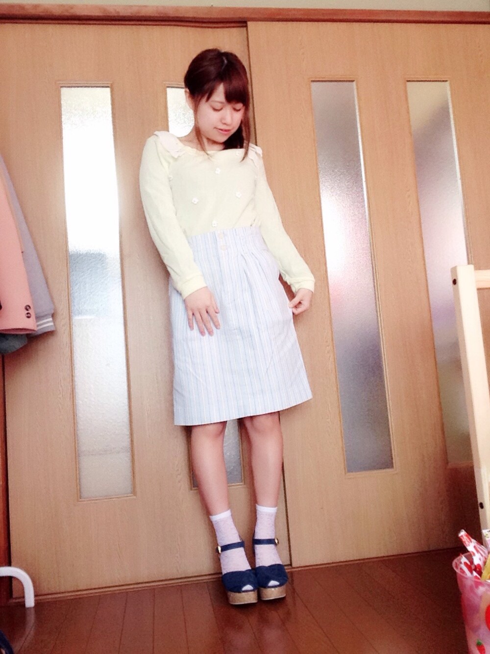 あったかくなって来ました! なので春らしいコーディネートを…❁ イエローの花モチーフ付きニットと サックス×イエローのストライプスカートを 合わせました(*^ω^*) 足元は白のレース柄靴下と ブルーのサンダルです✩ サンダルをはっきりした色にすると 安定感?が出ます ꒰ ´͈ω`͈꒱ 春物可愛くて ウィンドウショッピングだけでも 楽しいです♪笑