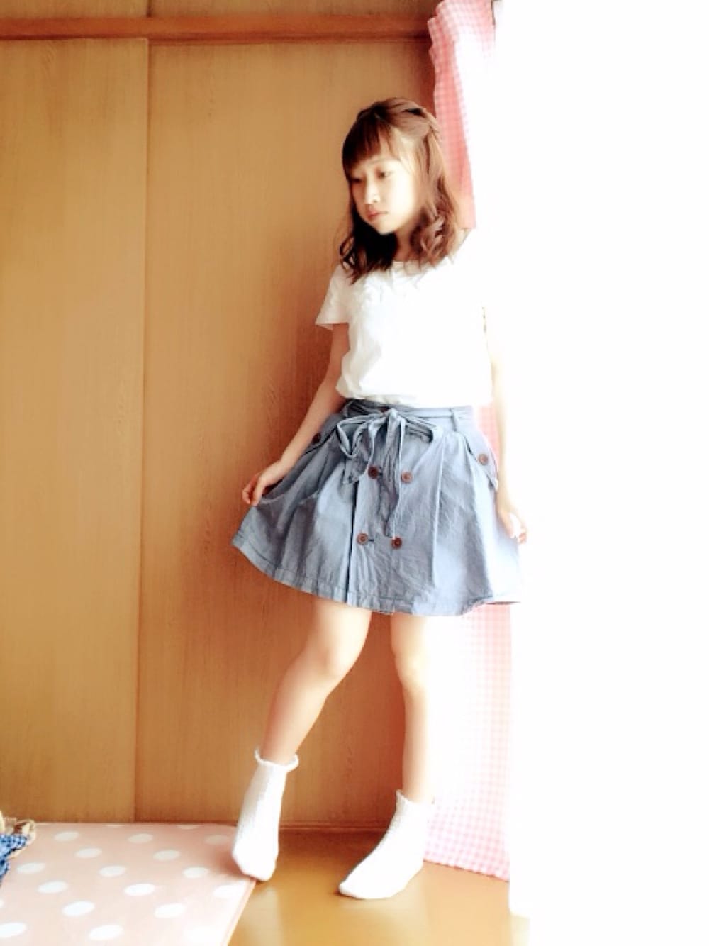 白Tシャツとブルーの前ボタンスカートの シンプルなコーディネートです(o´艸`) 夏に近づくにつれ 簡単なカッコになってきてます笑
