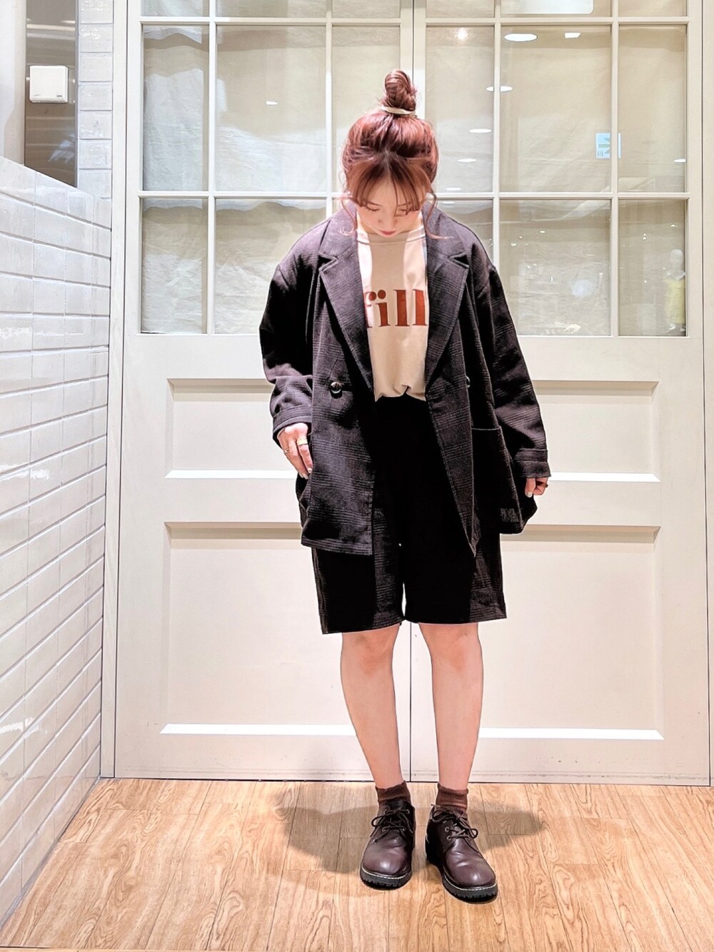 Misaki Makiのノーカラージャケット「グレンチェックテーラードジャケット(セットアップ可)」を使ったコーディネート