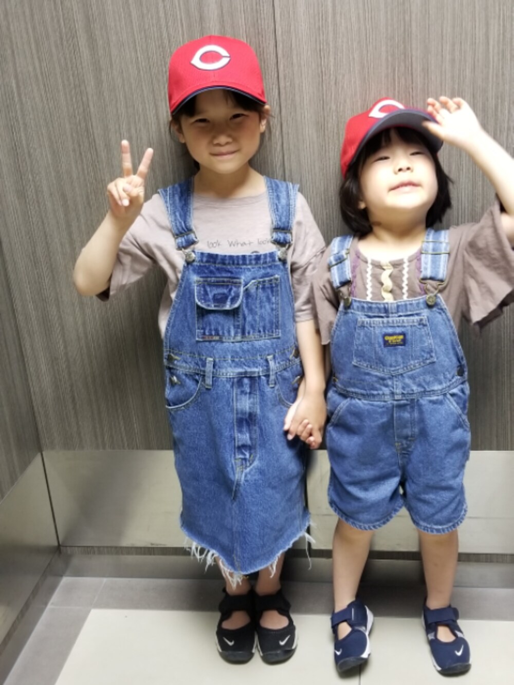 どんなコーデにも外せない… カープ帽子©️ 最近はオソロにしたいお年頃です⭐ 古着のサロペはどっちも ワンコイン💲 久々ですがフォロー外さずに いてくれる皆様、ありがとうございます😊
